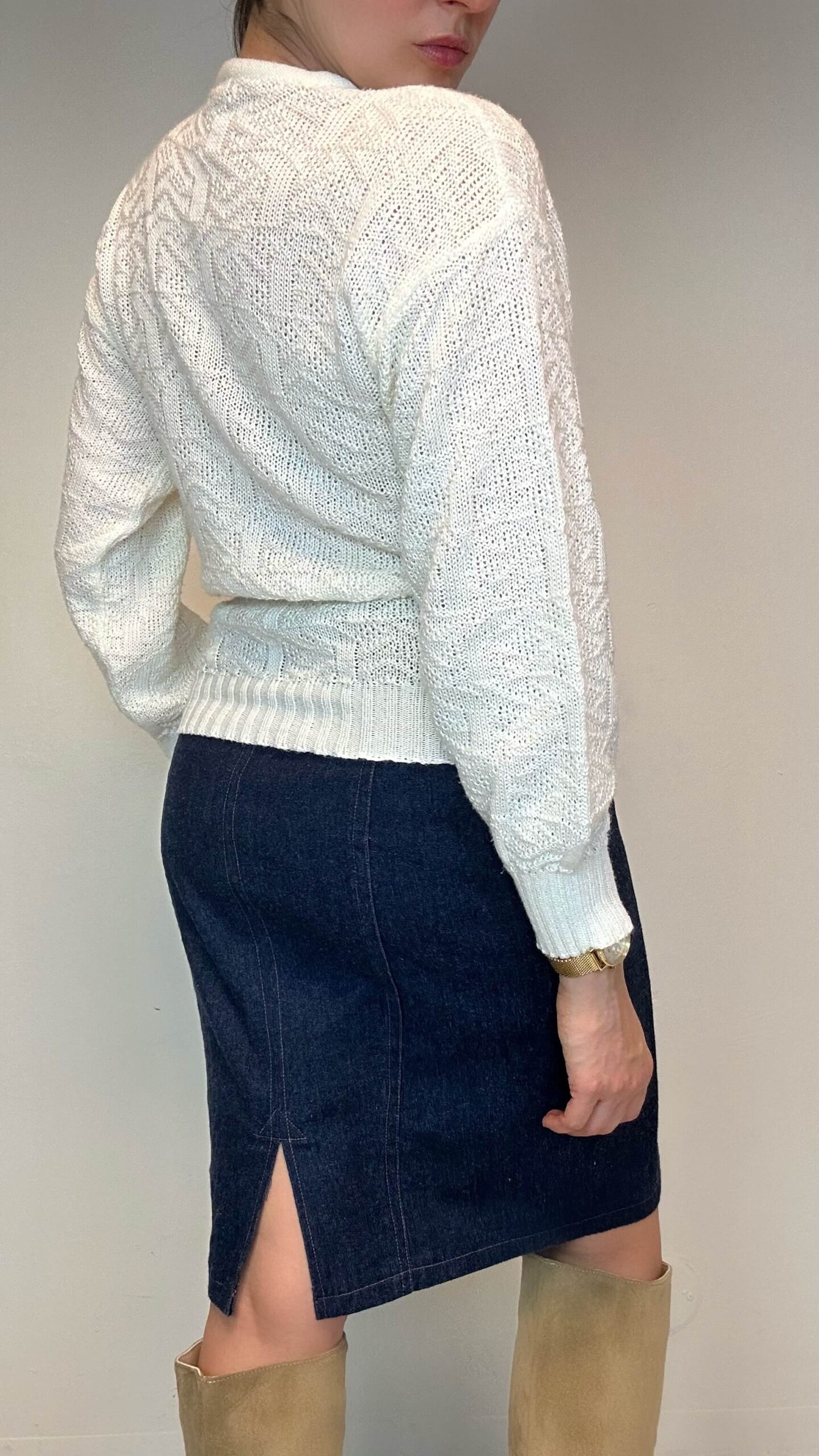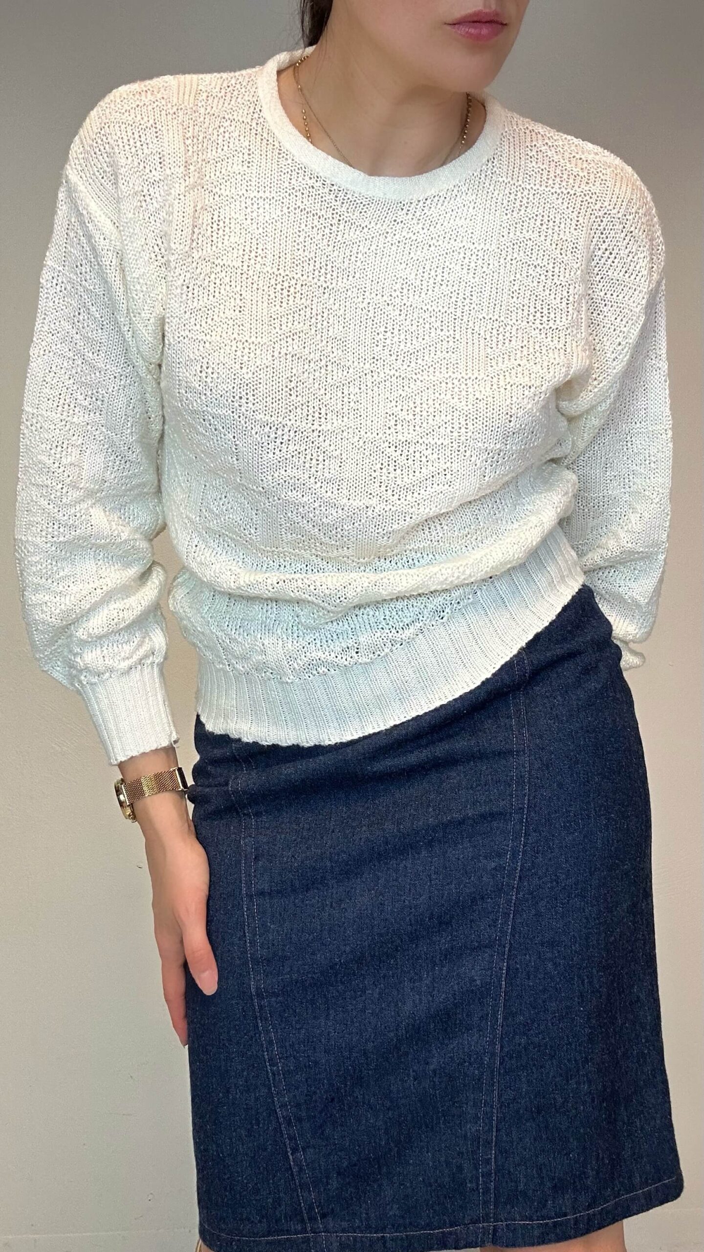 Basic off white structured sweater1 in stock 81$ Basic off white structured sweater. Material: Unknown. Viscose/Cotton mix Fit: XS/S 92cm Chest 66cm Sleeve (from the neckline) 57cm Length 1 in stock Basic off white structured sweater quantity Add to cart Categories: All, Cardigans & knitwear