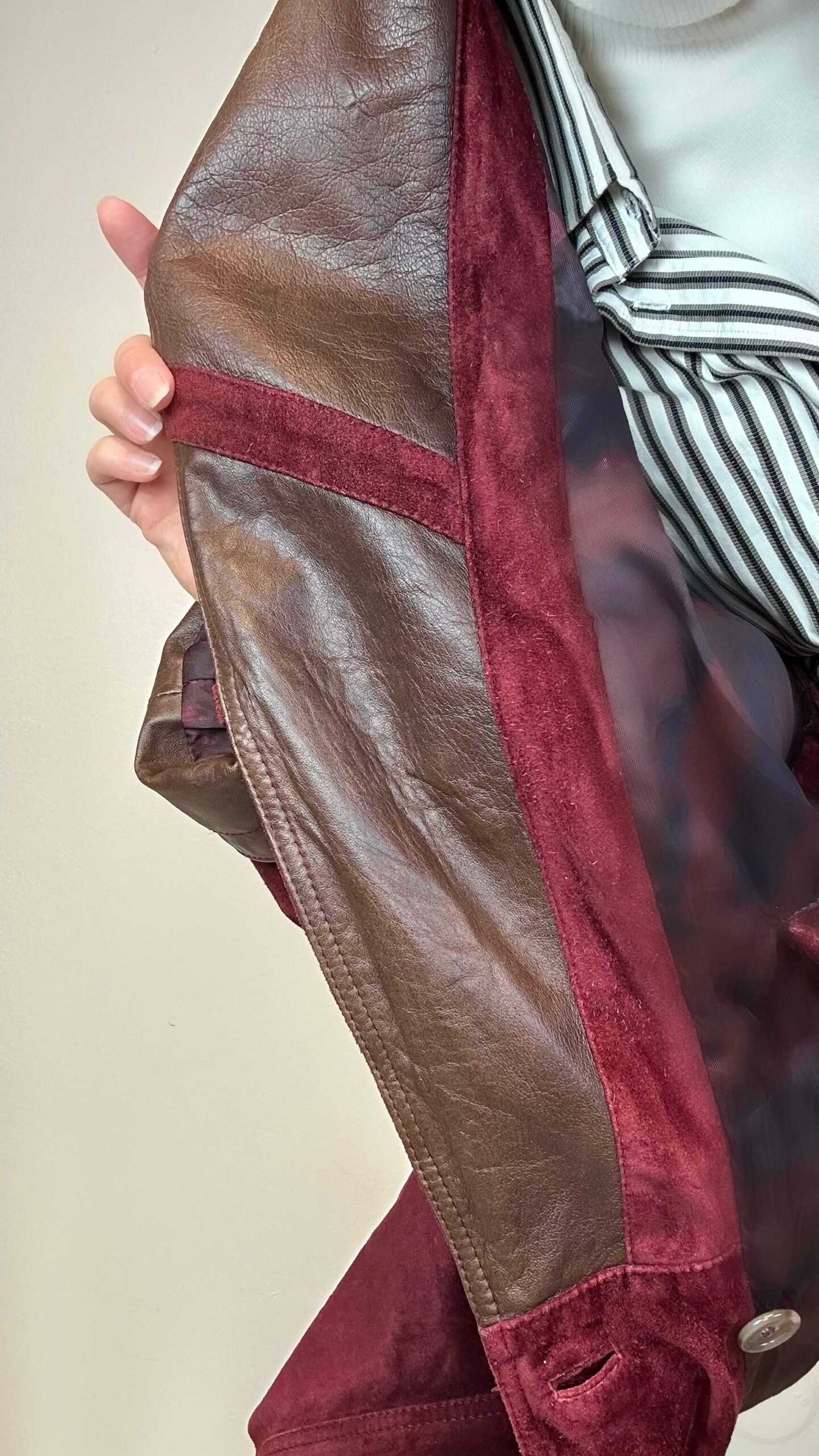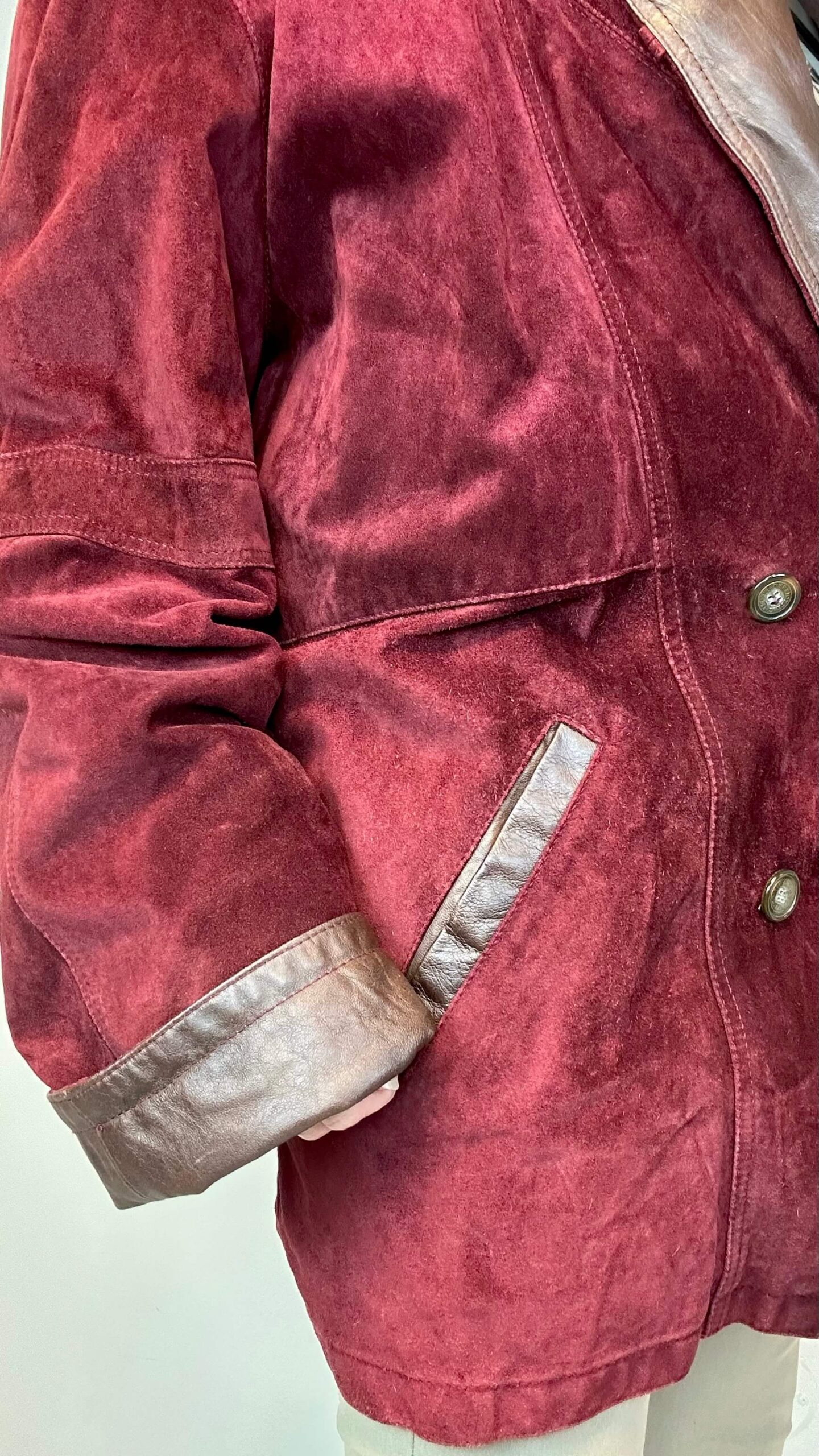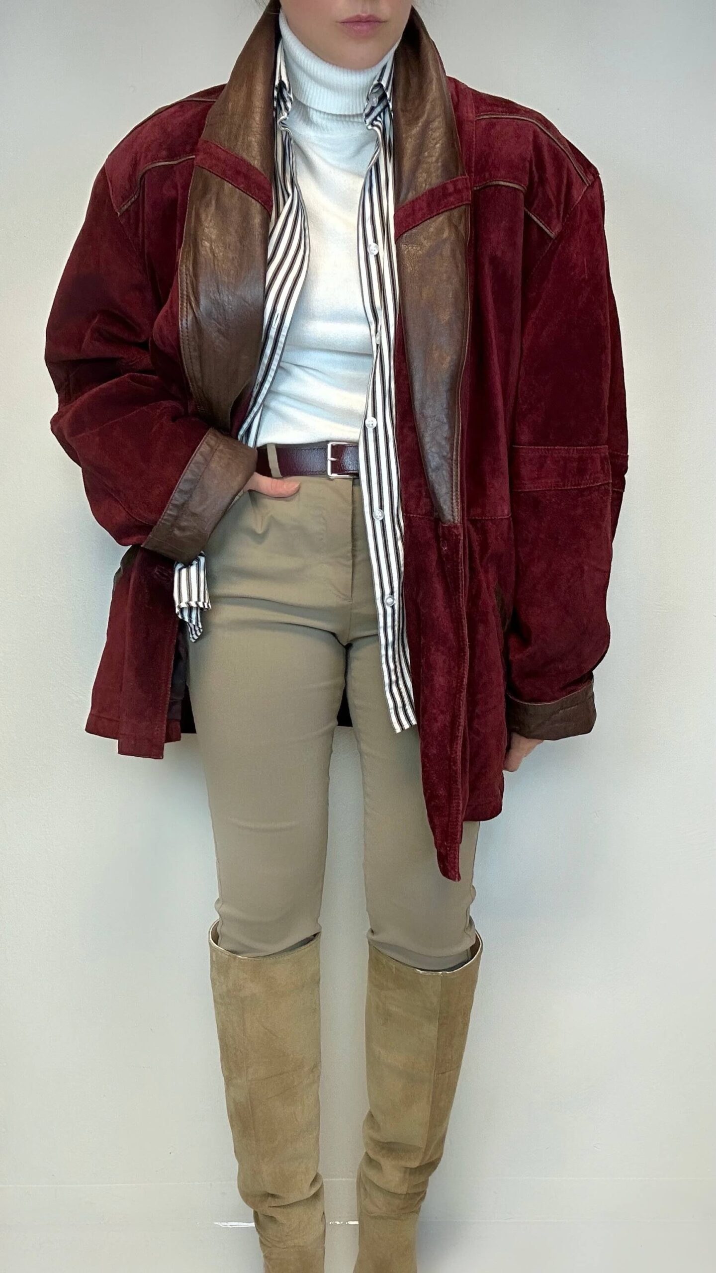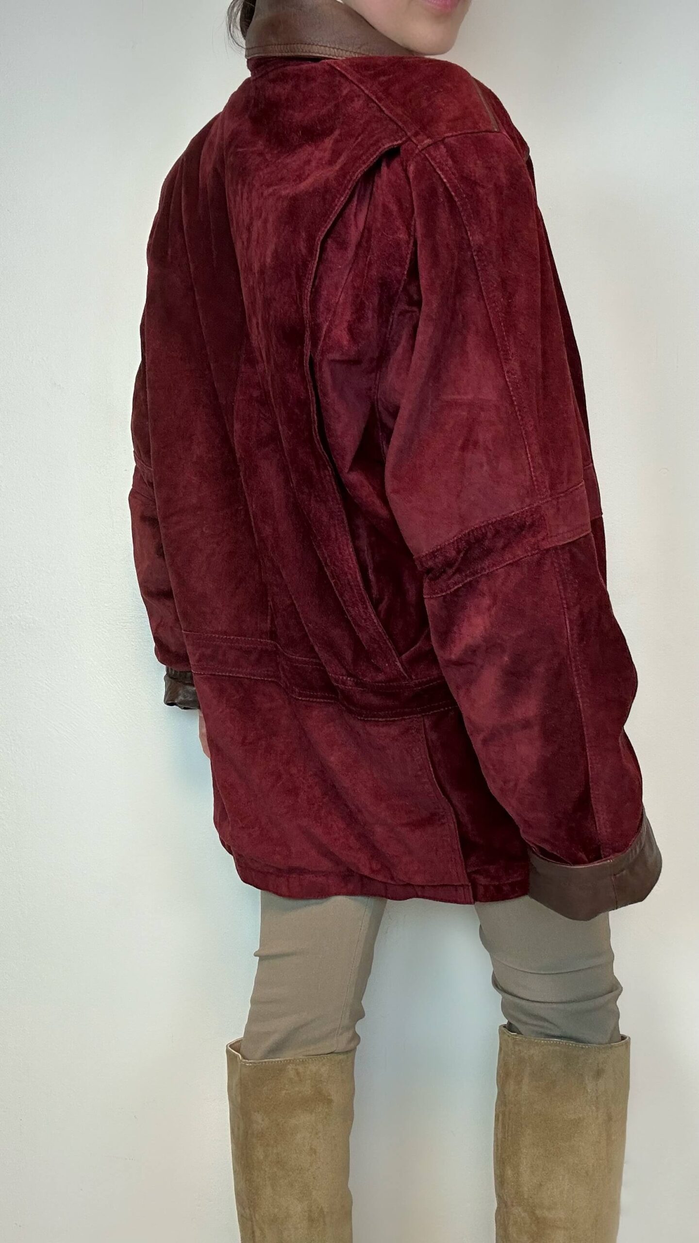 Burgundy suede leather jacket1 in stock 180$ Burgundy suede leather jacket. Material: 100% Leather Fit: XL/XXL/3XL. Depends on desired fit 132cm Chest 84cm Sleeve (from the neckline) 79cm Length 1 in stock Burgundy suede leather jacket quantity Add to cart Category: Subscribers