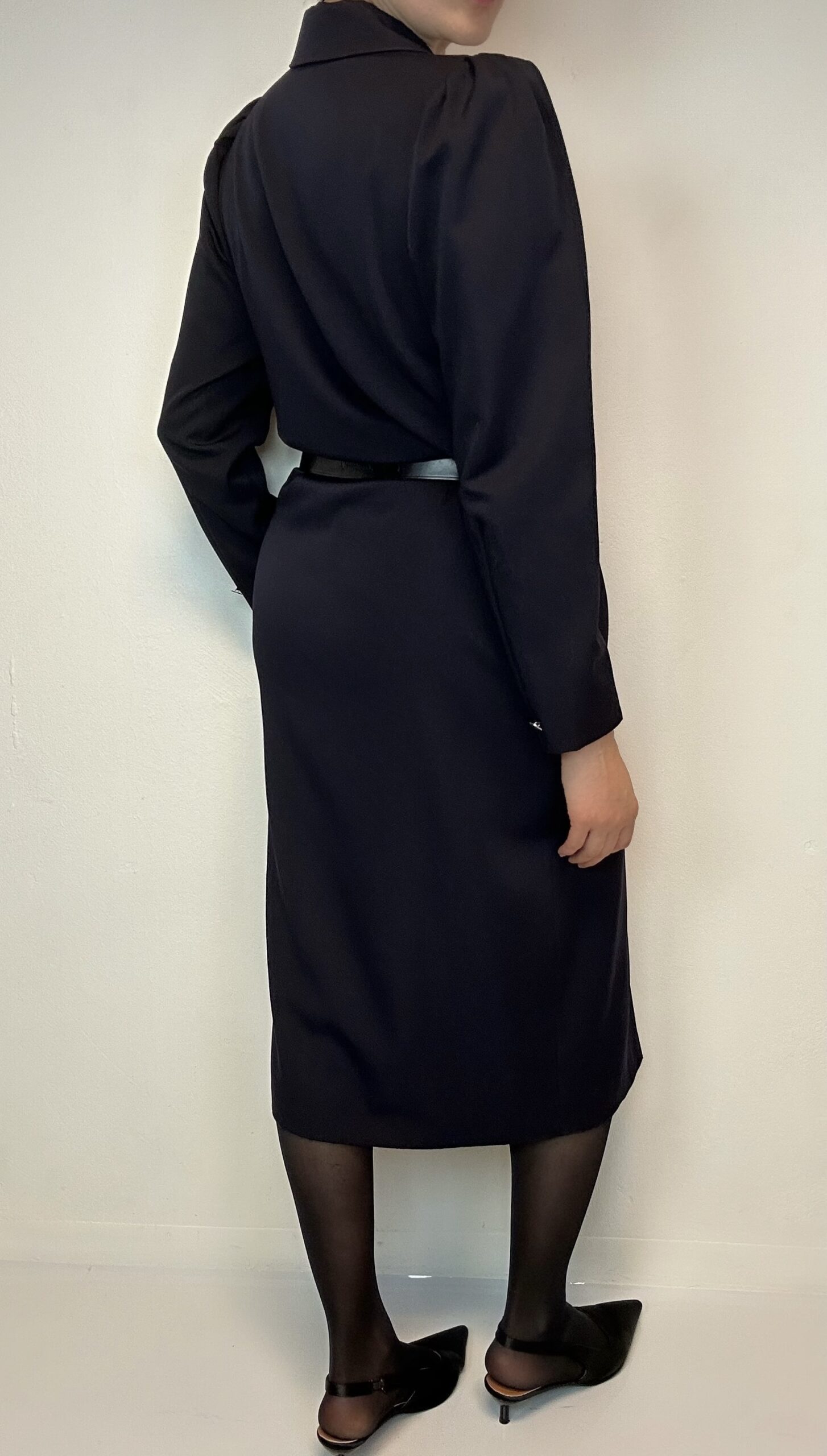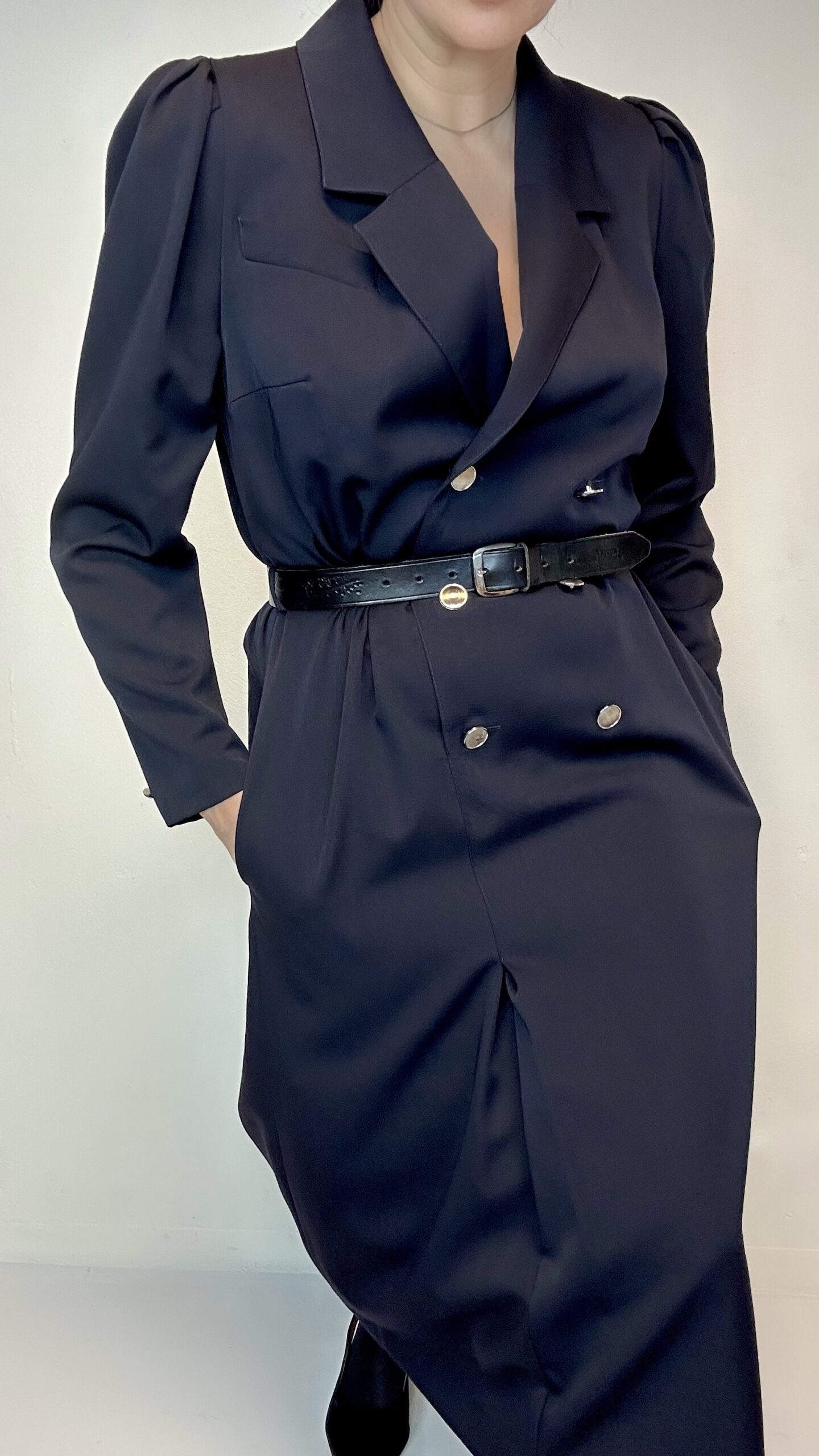 Business double-breasted navy blue dress1 SoldSOLD 137$ Business double-breasted navy blue dress Material: 45% Wool 55% Polyester Fit: S/M (36/38) 37cm Shoulder to shoulder 100cm Chest 62cm Sleeve (from the shoulder) 104,5cm Hips 114cm Length SOLD Categories: All, Dresses