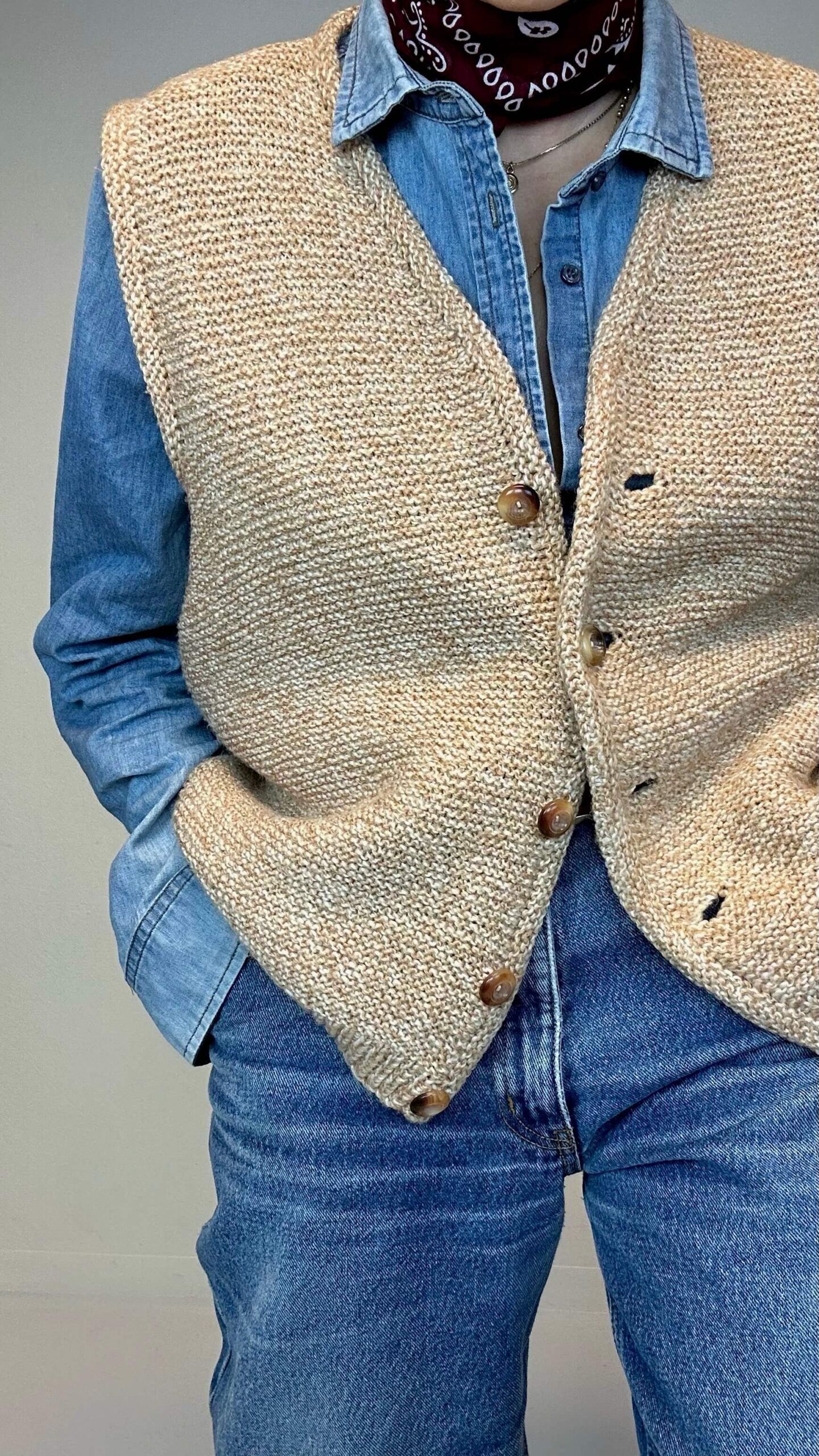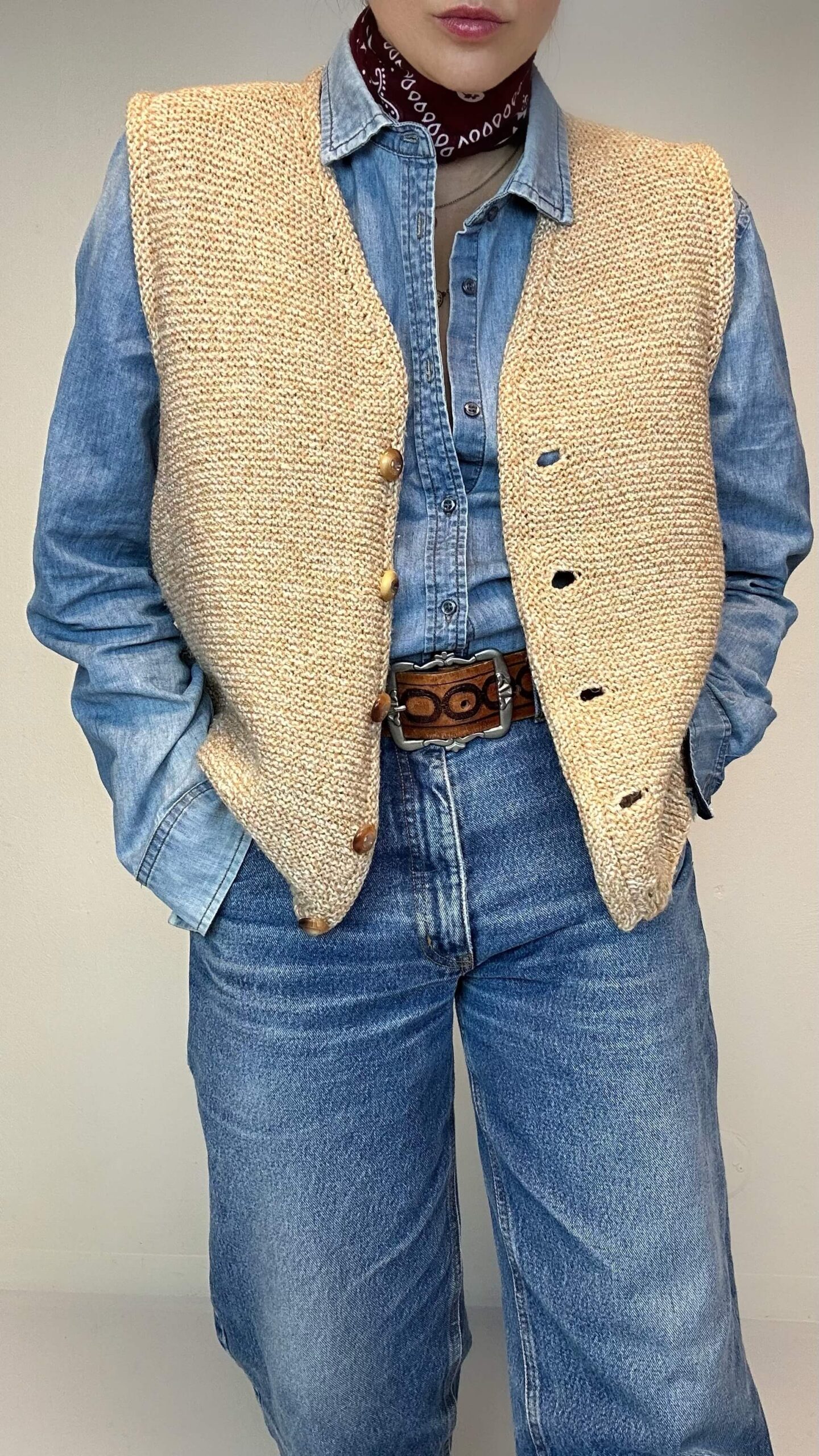 Camel beige wool knitted vest with candy buttons1 in stock 68$ Camel beige wool knitted vest with candy buttons. Material: Wool Fit: M/L/XL. Depends on desired fit. 110cm Chest 59cm Length 1 in stock Camel beige wool knitted vest with candy buttons quantity Add to cart Categories: All, Vests