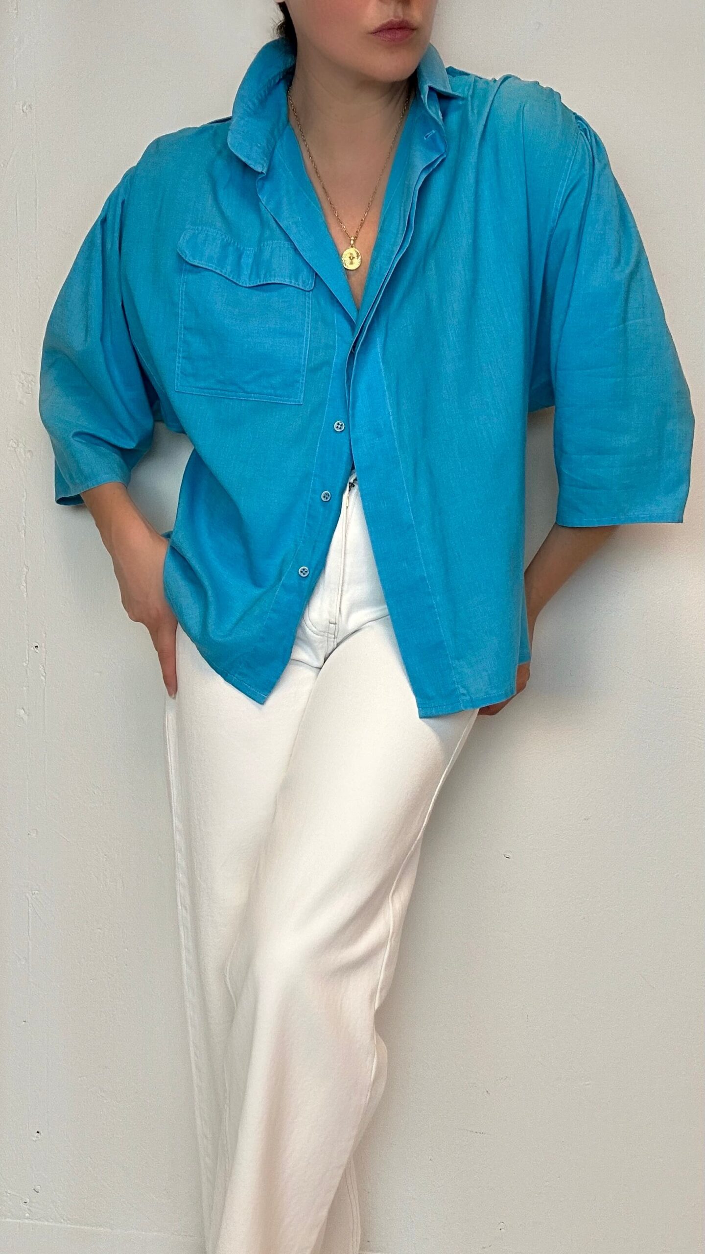 Cozy long blue cotton blouse with bat sleeves1 in stock 84$ Cozy long blue cotton blouse with bat sleeves. Material: 47% Cotton 42% Modal 11% Linen Fit: M/L 42cm Shoulder to shoulder 110cm Chest 98cm Waist 64cm Length 1 in stock Cozy long blue cotton blouse with bat sleeves quantity Add to cart Categories: All, Blouses