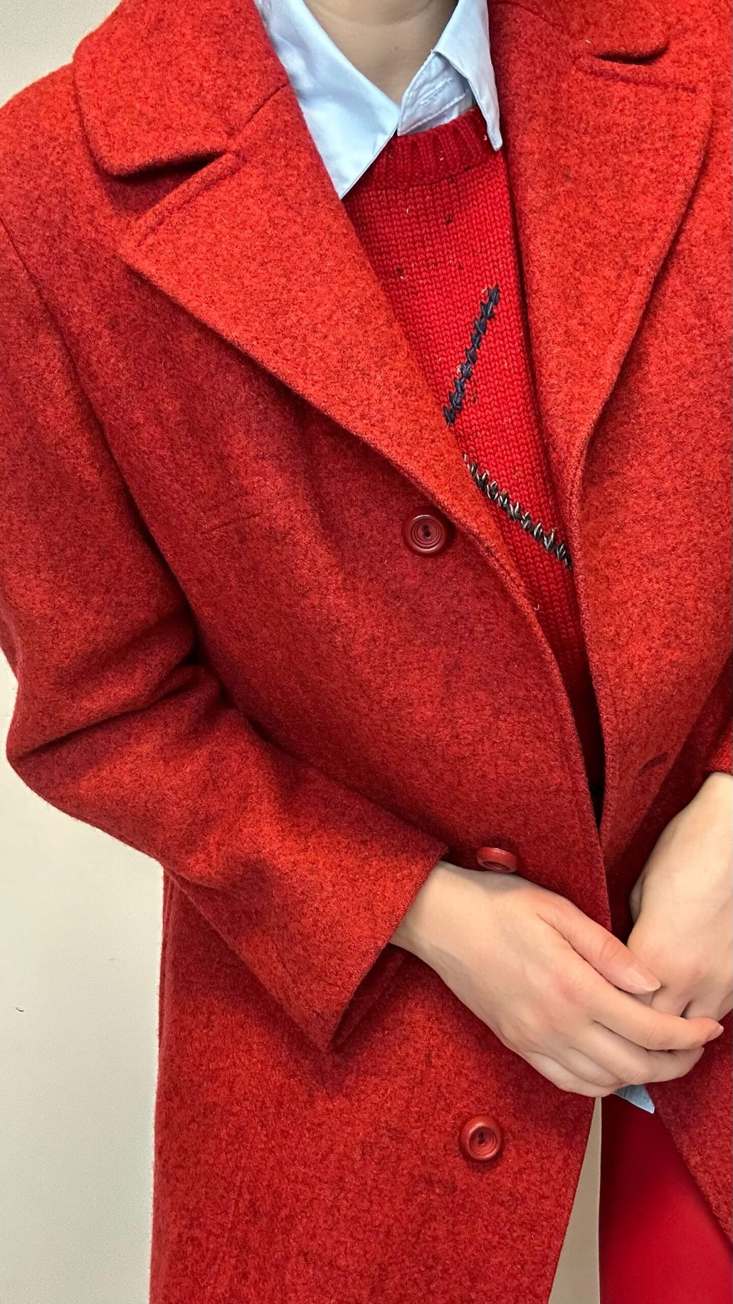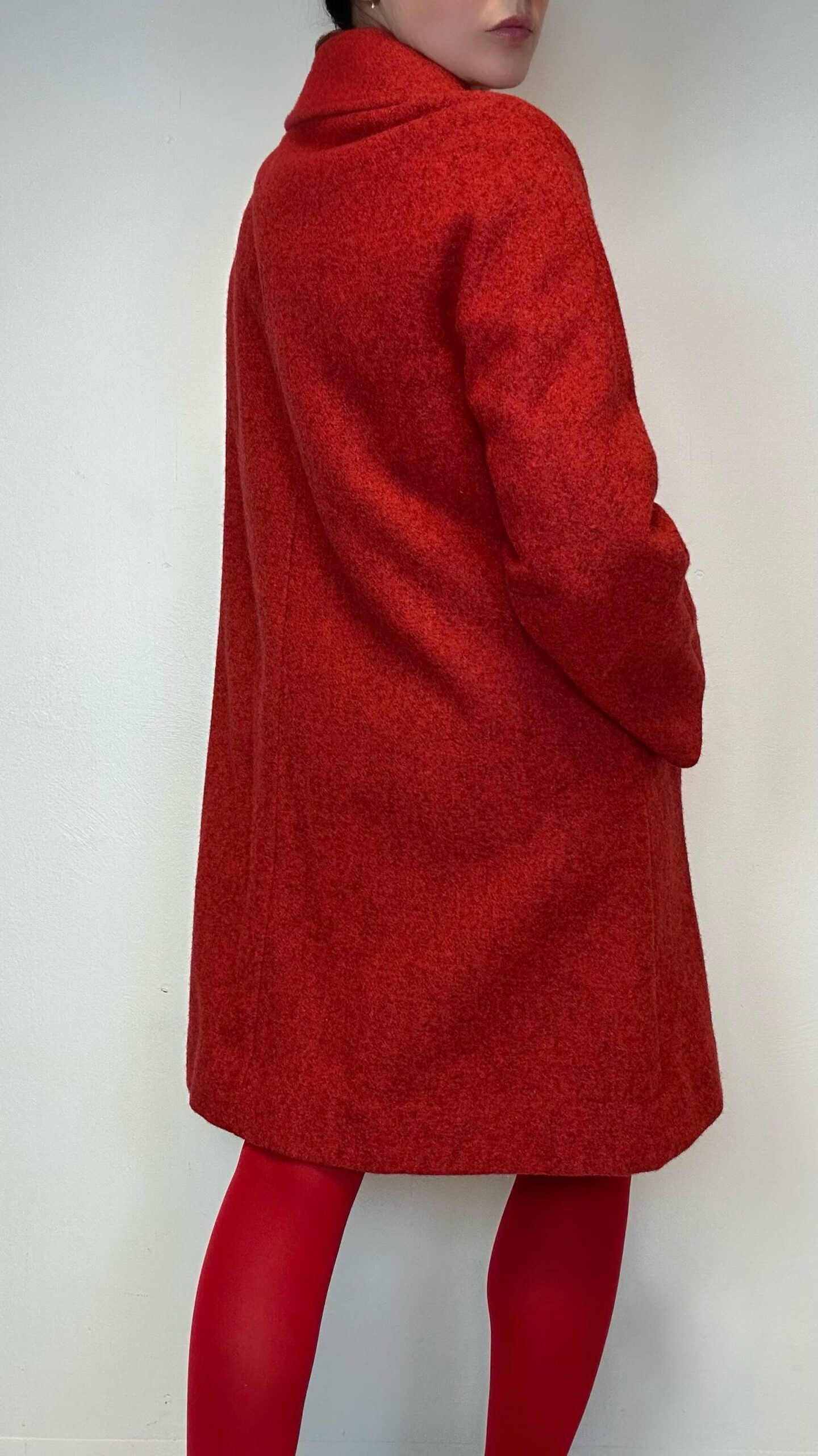 Fire brick red woolen coatSOLD 186$ Fire brick red woolen coat Material: 100% Wool Fit: M 106cm Chest 74cm Sleeve (from the neckline) 93cm Length SOLD Categories: All, Coats & Jackets