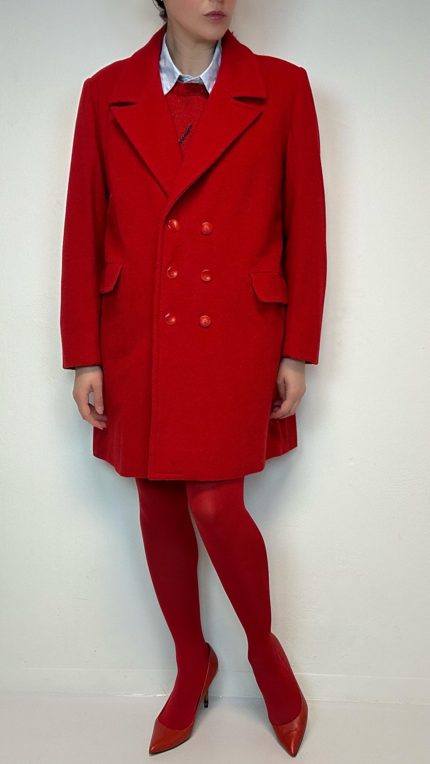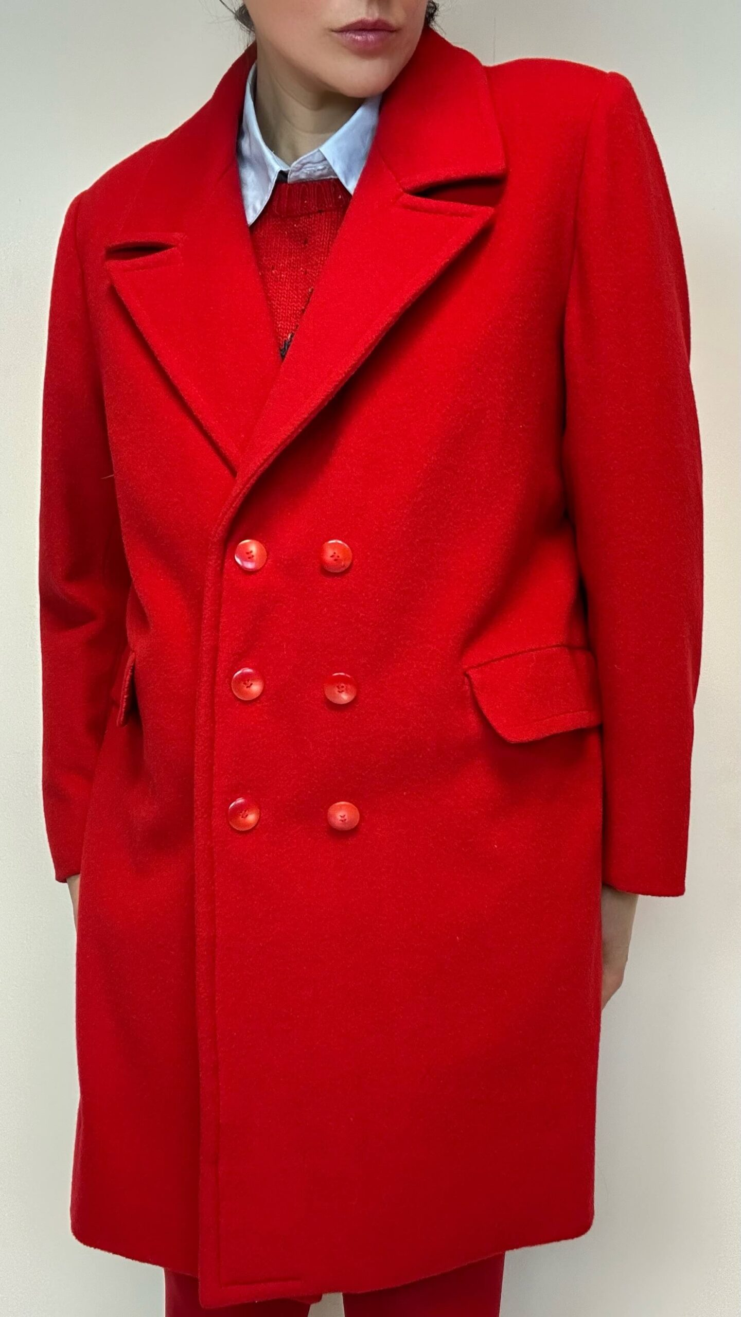 Fire red double-breasted woolen coatSOLD 195$ Fire red double-breasted woolen coat Material: 100% Wool Fit: M 45cm Shoulder to shoulder 118cm Chest 61cm Sleeve (from the shoulder) 87cm Length SOLD Categories: All, Coats & Jackets