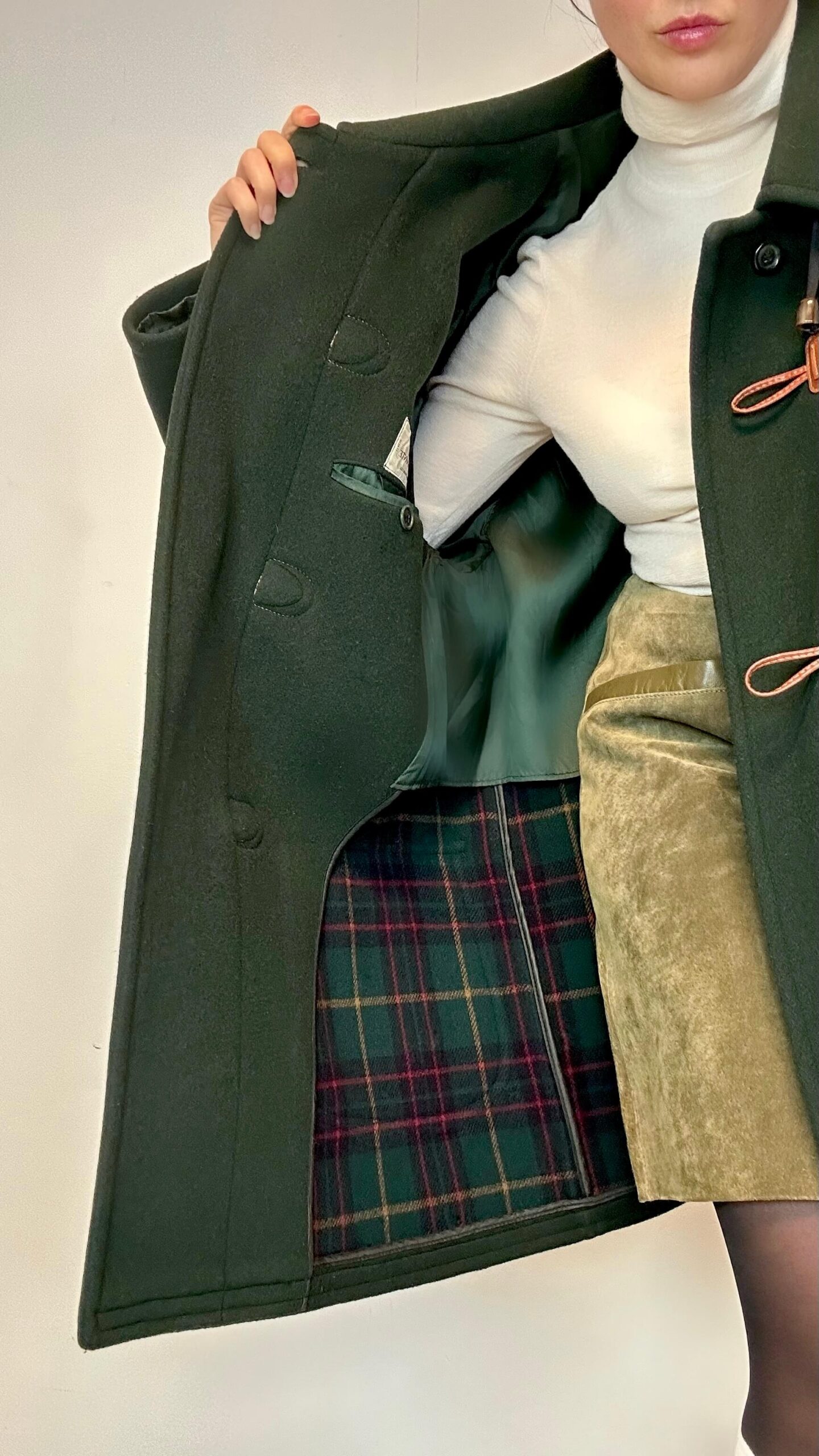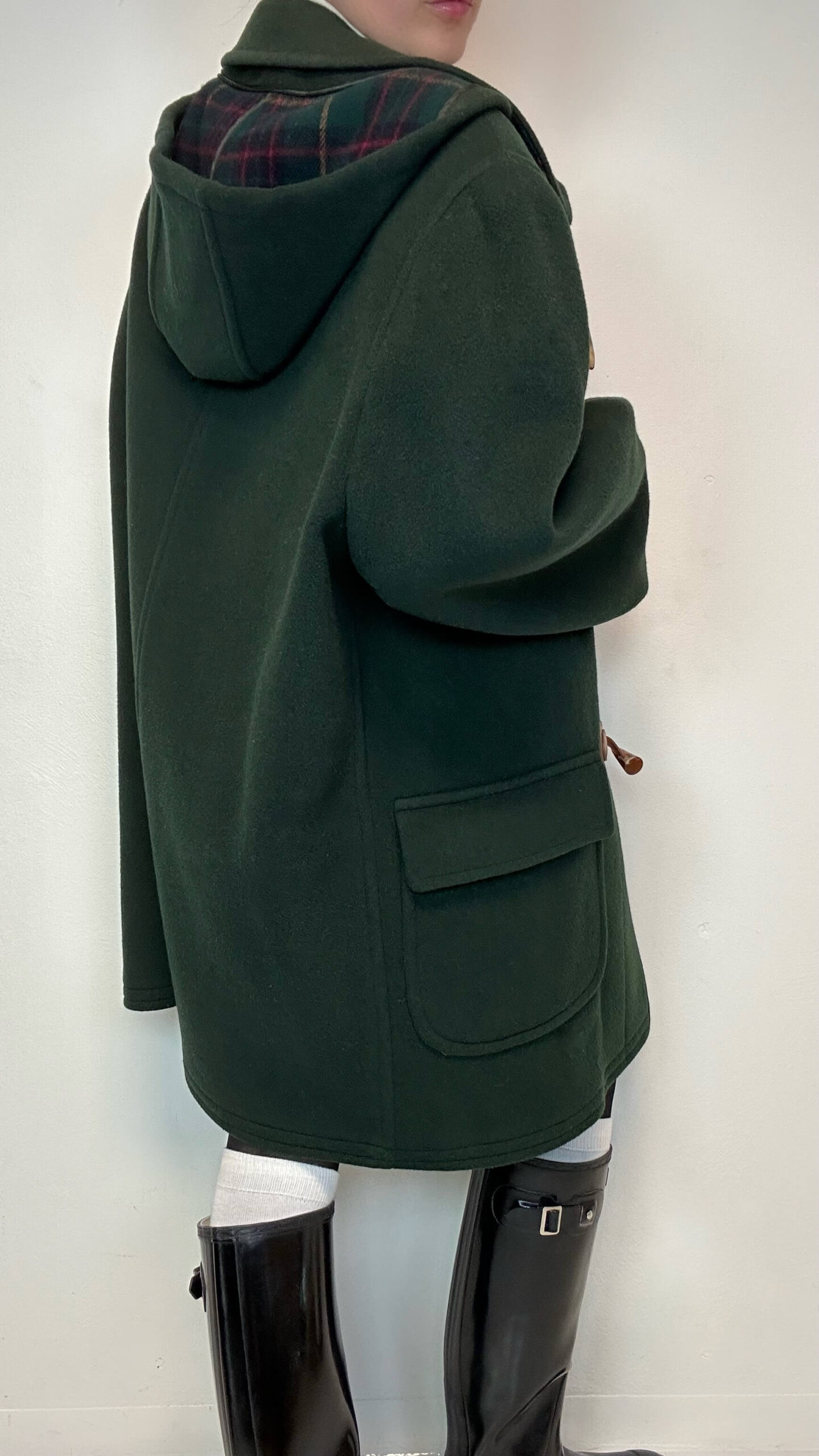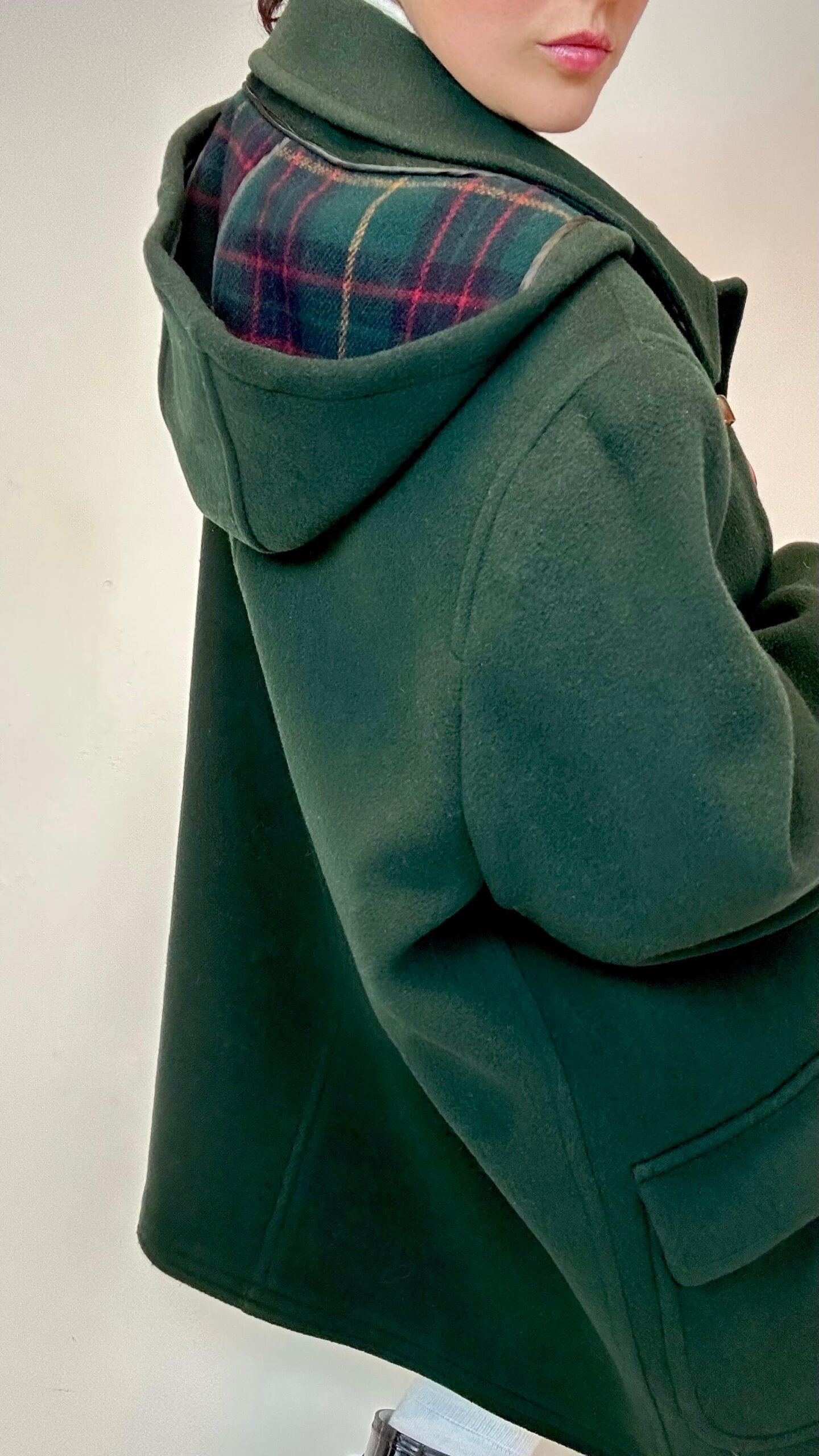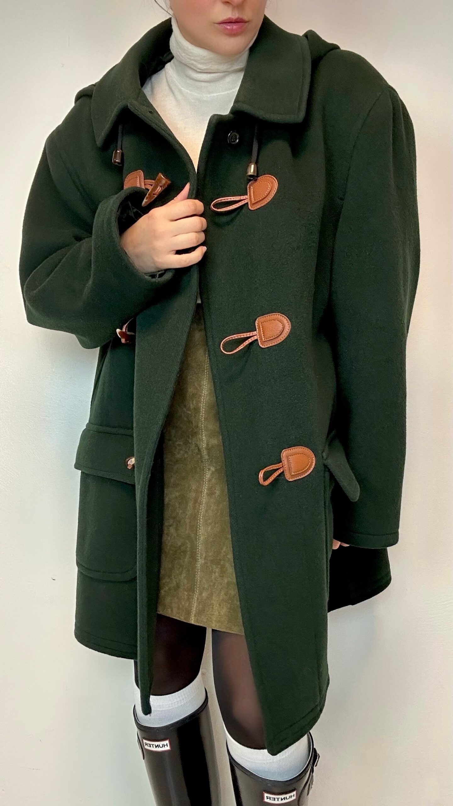 Green woolen winter duffle coat with bold shoulders and detachable hood.