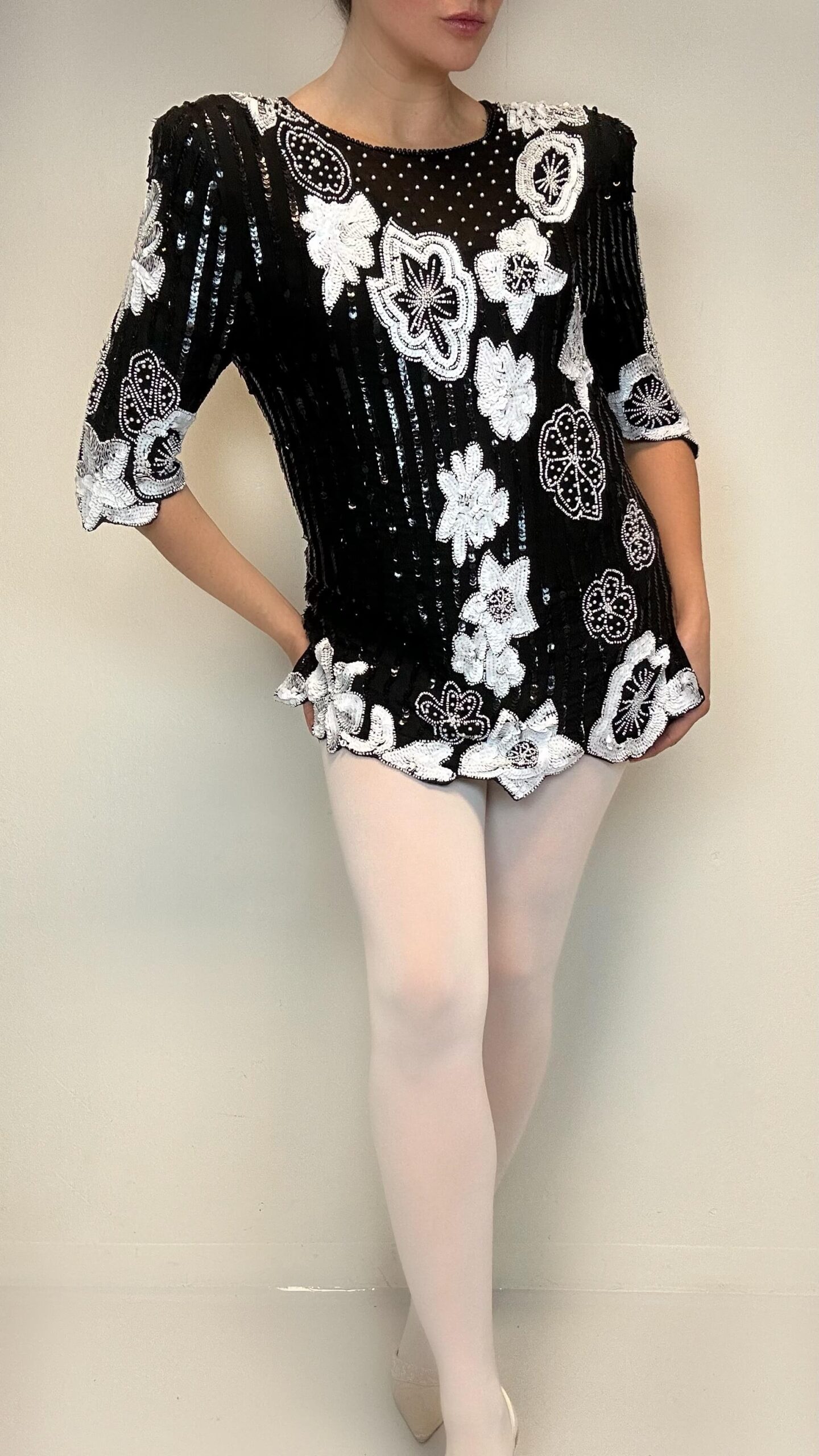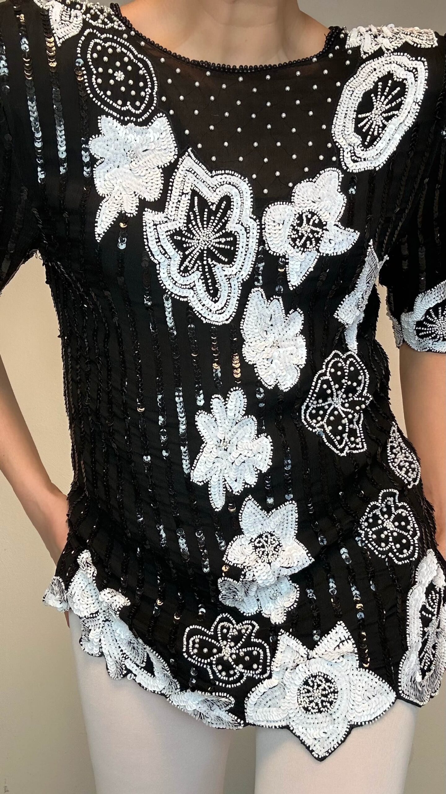 Midnight garden sequin silk blouse1 in stock 161$ Midnight garden sequin silk blouse. Material: 100% Silk Lining: Polyester Fit: M/L 42cm Shoulder to shoulder 90cm Chest 65cm Length 1 in stock Midnight garden sequin silk blouse quantity Add to cart Categories: All, Blouses