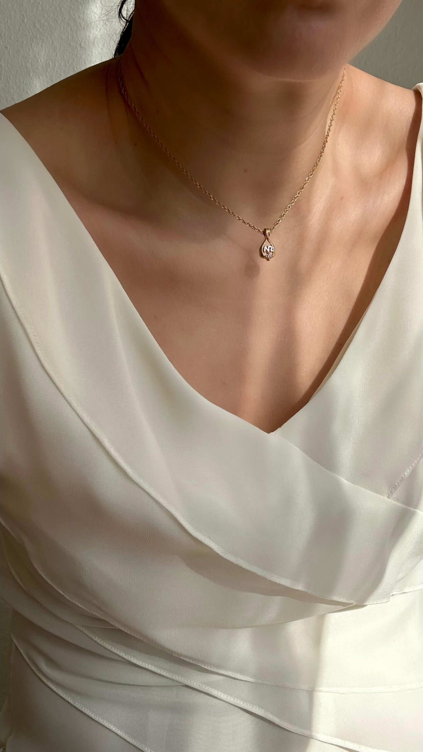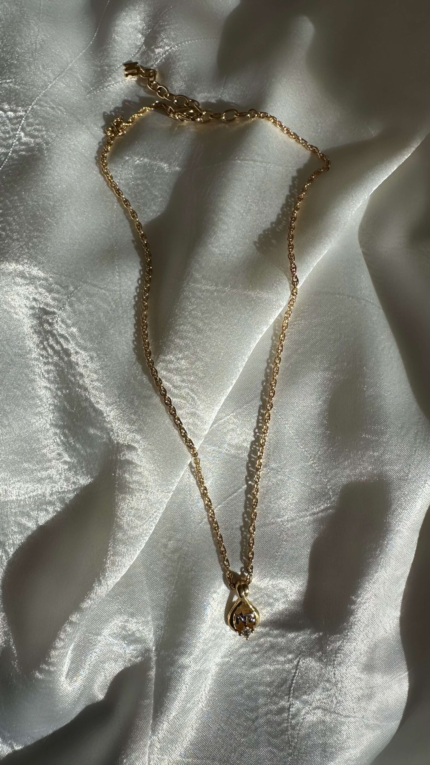 Nina Ricci necklace, featuring the NR logo housed in a harp-like ornate frame, accented with a rhinestone crystal below.