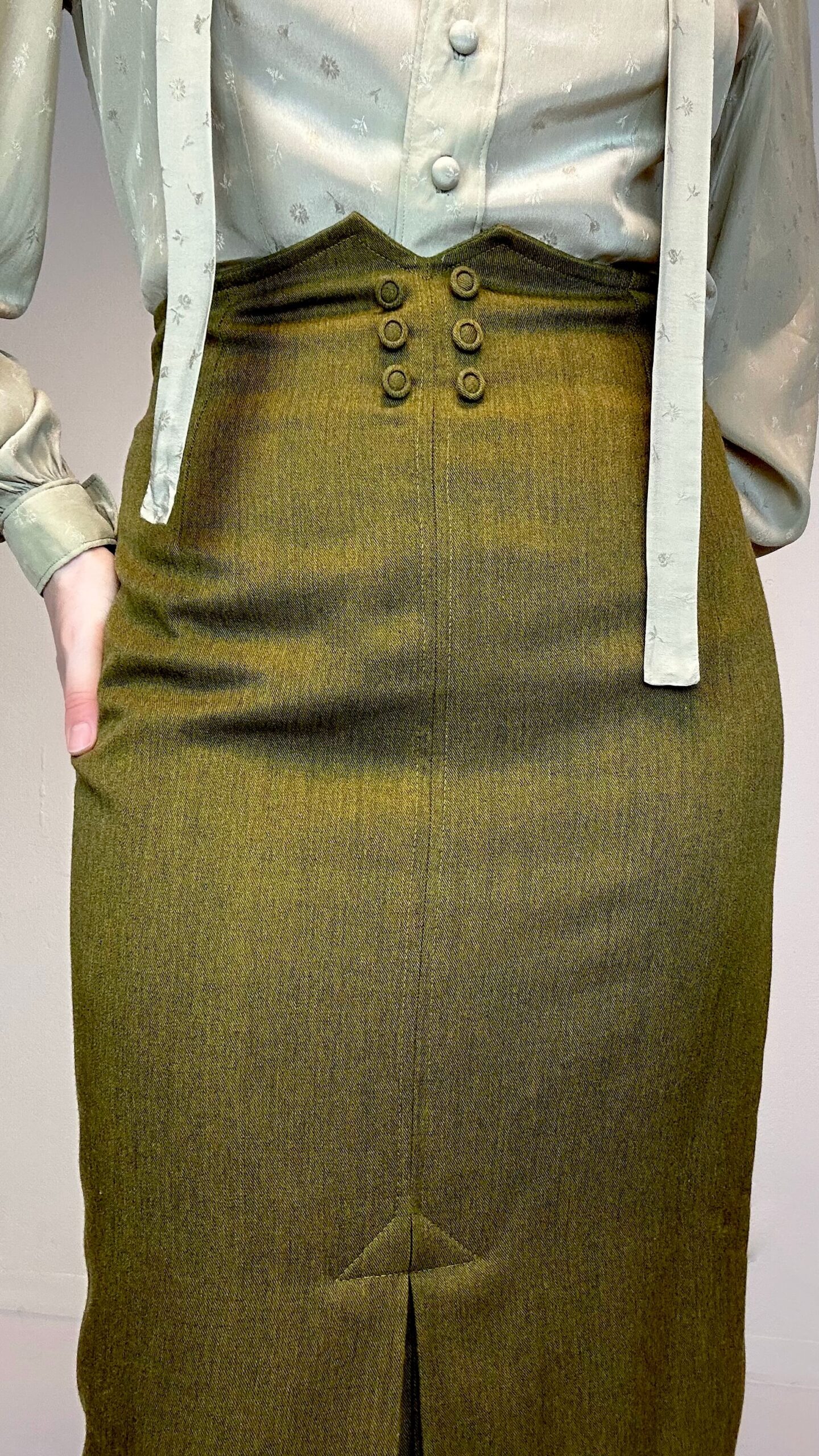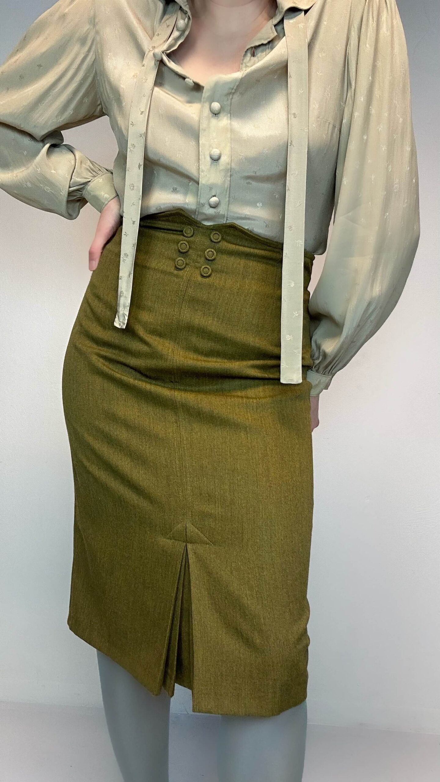 Italian olive green high waist office skirt1 in stock 90$ Italian olive green high waist office skirt Material: 36% Viscose 64% Polyester Fit: M 73cm Waist 98cm Hips 68cm Length 1 in stock Italian olive green high waist office skirt quantity Add to cart Categories: All, Bottoms, Subscribers