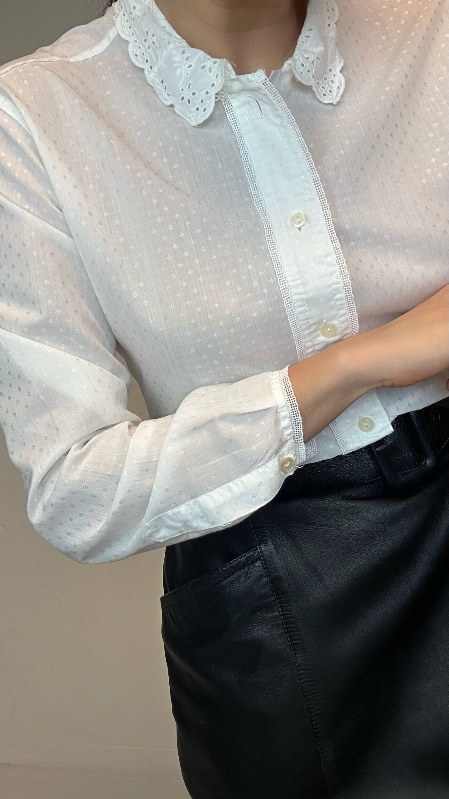 Patterned white blouse with embroidered collar1 in stock 78$ Patterned white blouse with embroidered collar. Material: Cotton mix. Label is missing Fit: M/L 44cm Shoulder to shoulder 96cm Chest 57cm Sleeve( from the shoulder ) 73cm Length 1 in stock Patterned white blouse with embroidered collar quantity Add to cart Categories: All, Blouses