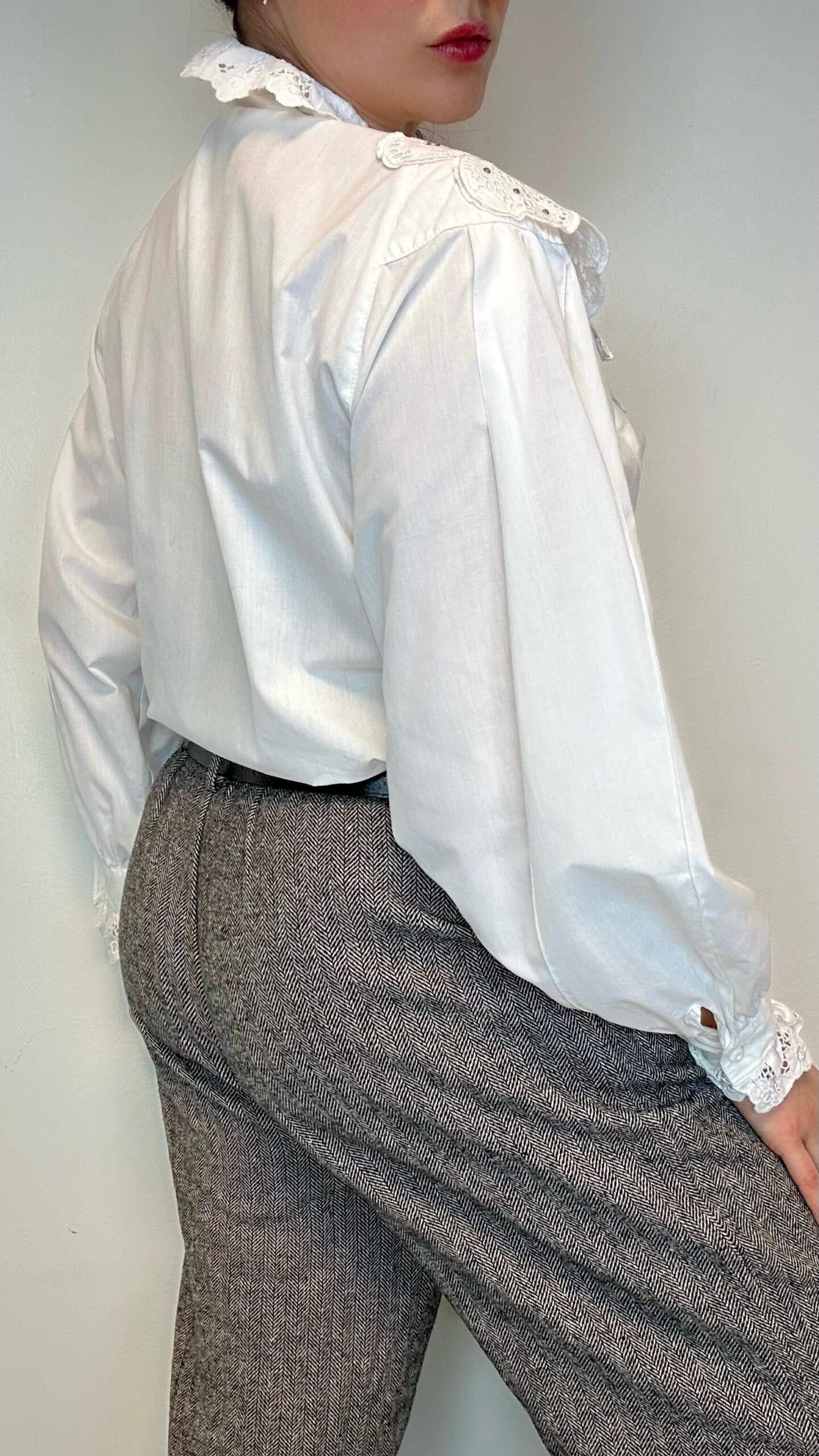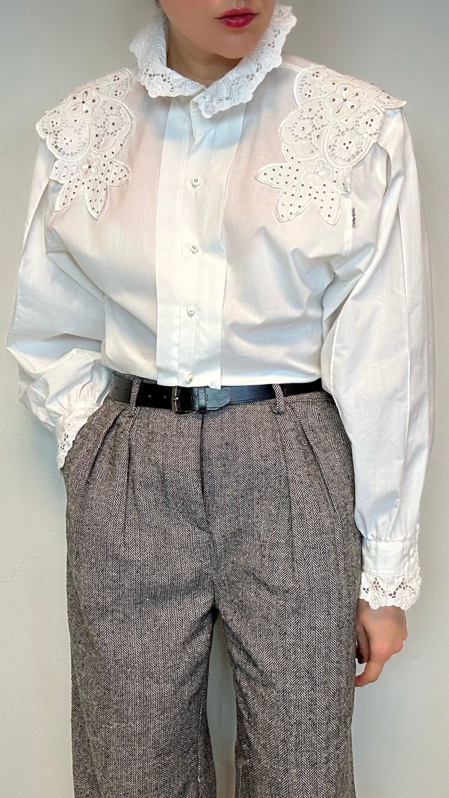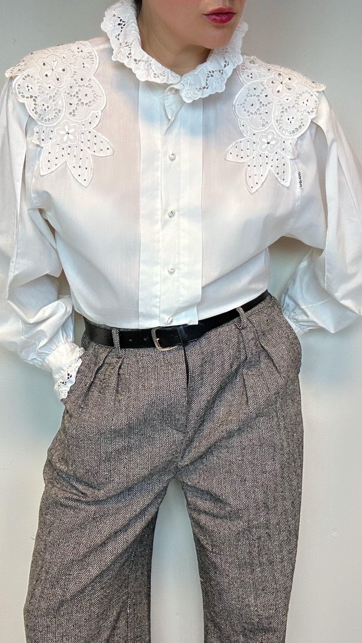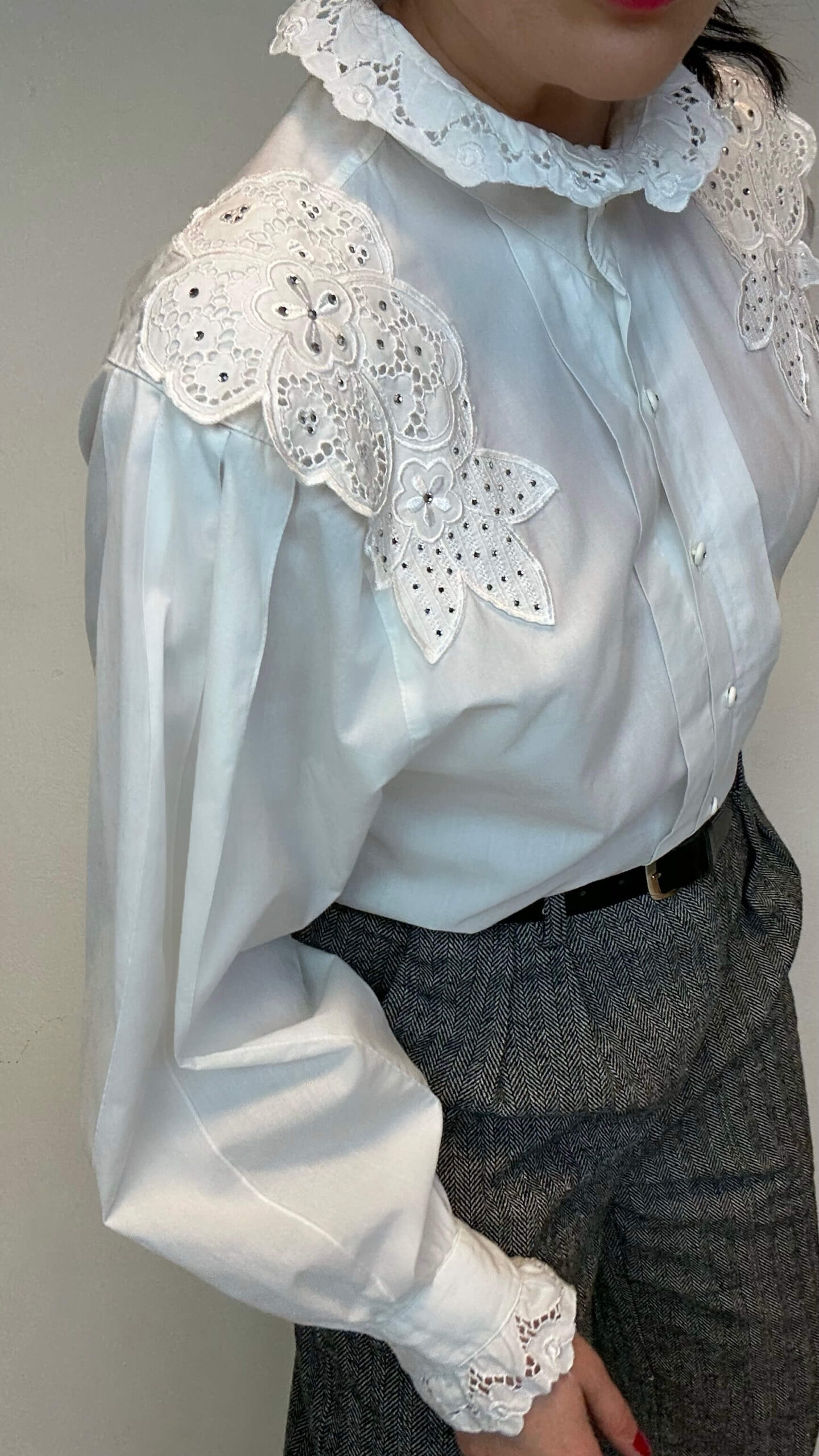 Rare ruffle blouse with a festive flower embroidery1 in stock 119$ Rare ruffle blouse with a festive flower embroidery Material: 50% Cotton 50% Polyester Fit: L 102cm Chest 75cm Sleeve (from the neckline) 62cm Length 1 in stock Rare ruffle blouse with a festive flower embroidery quantity Add to cart Categories: All, Blouses