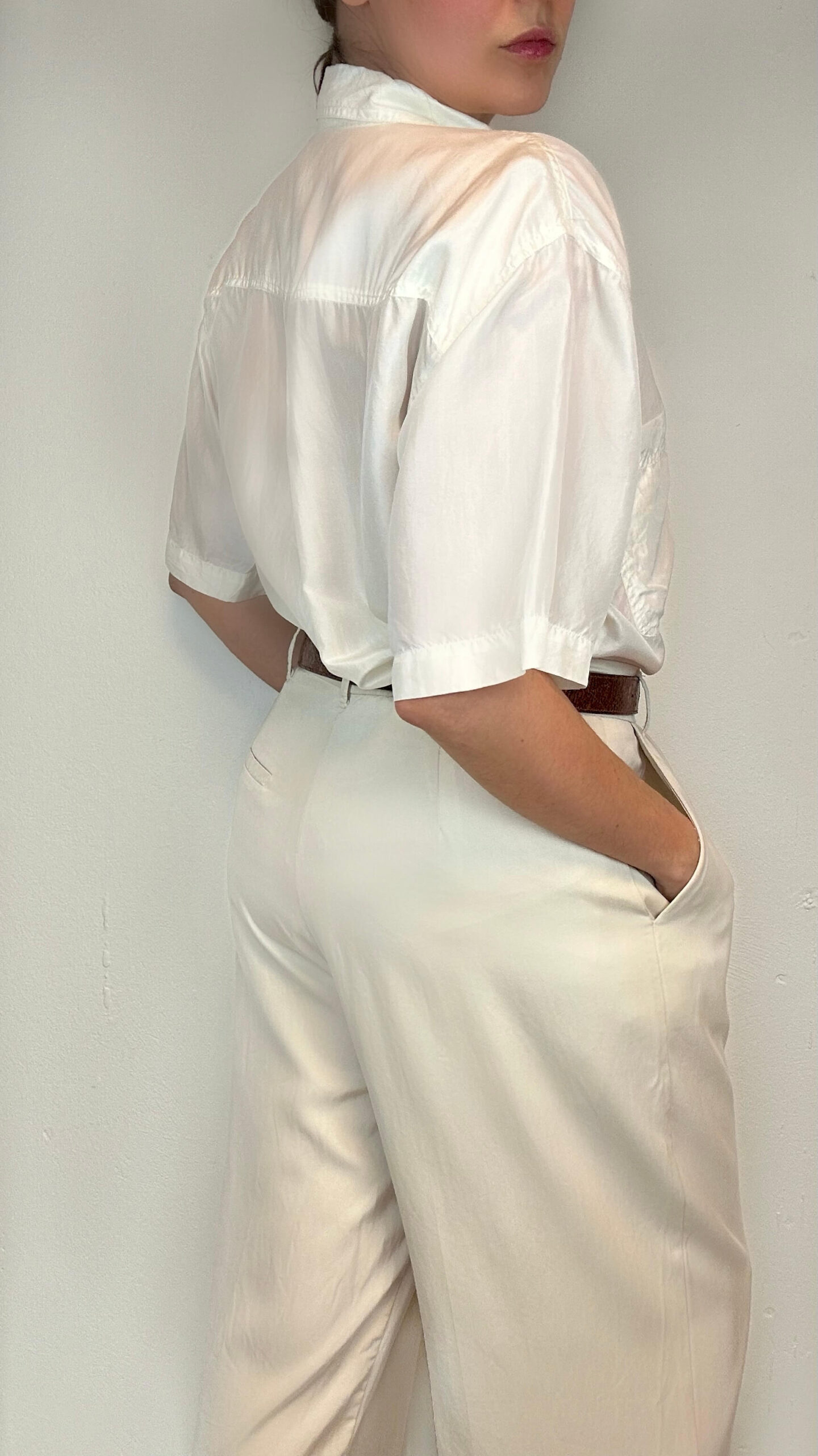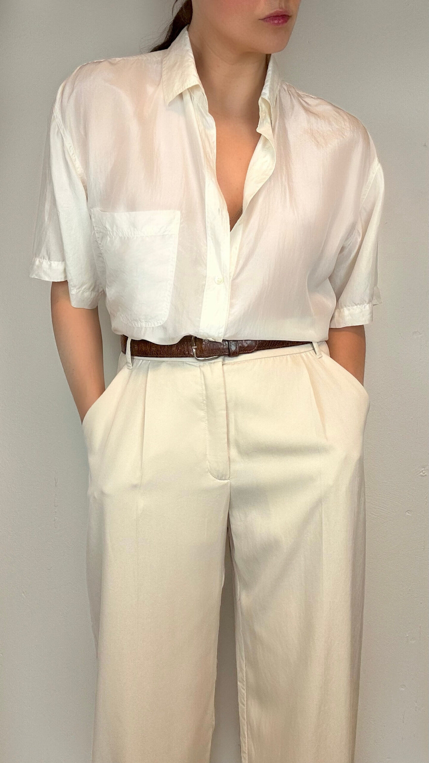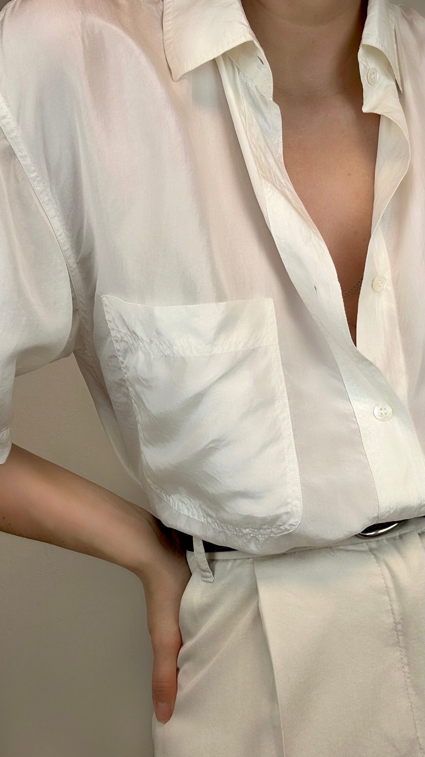 Silk champagne beige old money shirtSOLD 90$ Silk champagne beige old money shirt. Unisex. Material: 100% Silk Fit: L/XL 51cm Shoulder to shoulder 114cm Chest 79cm Length SOLD Categories: All, Blouses