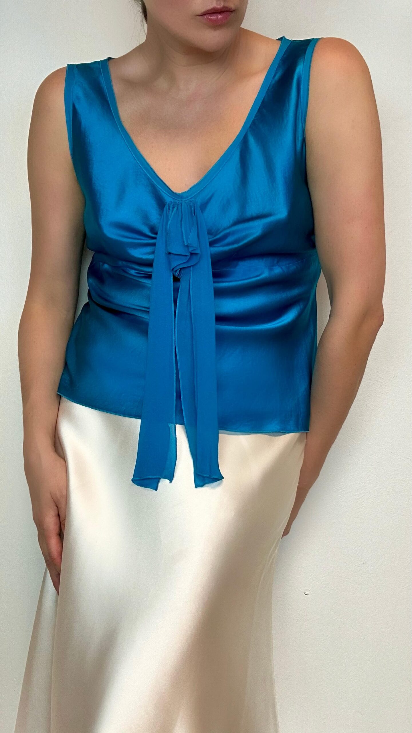 Silk Luisa Spagnoli elegant top with a bowSOLD 90$ Silk Luisa Spagnoli deep blue top with a bow. Material: 100% Silk Fit: S/M 92cm Chest 60cm Length SOLD Categories: All, Blouses
