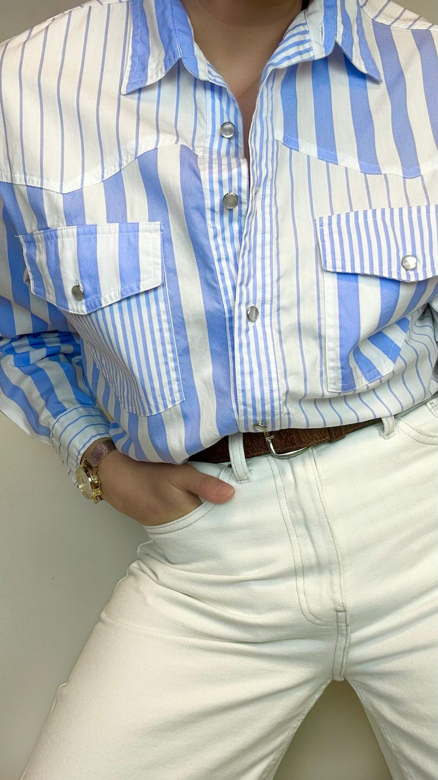 Striped shirt with pearl buttonsSOLD 80$ Striped shirt with pearl buttons. Material: 100% Cotton Fit: S/M 52cm Shoulder to shoulder 102cm Chest 52cm Sleeve (from the shoulder) 75cm Length SOLD Categories: All, Blouses