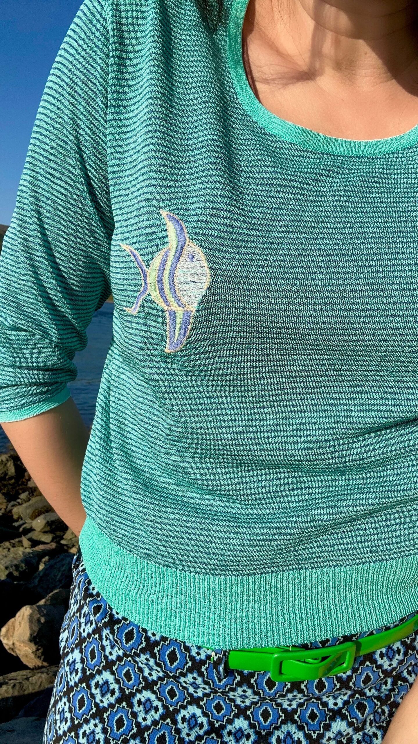 Striped 3/4 sleeve summer knit with a fish embroidery.