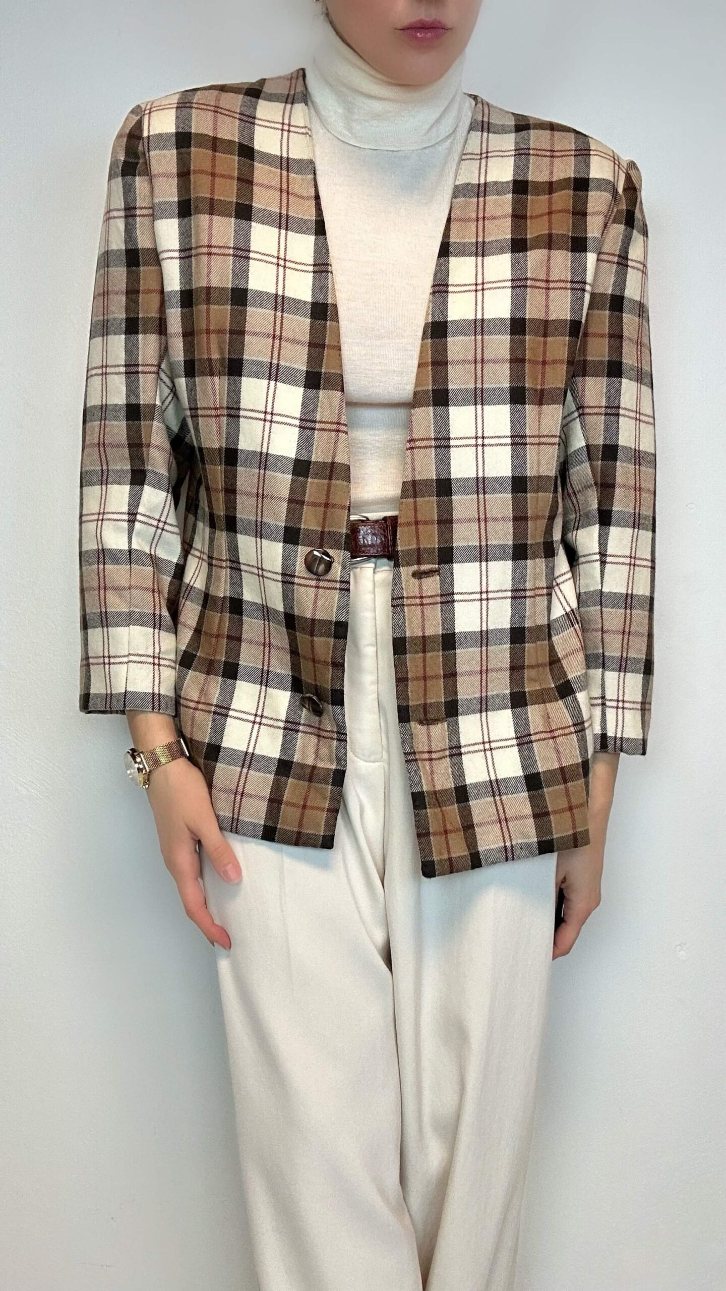 Tartan woolen jacket with a deep v-neck.