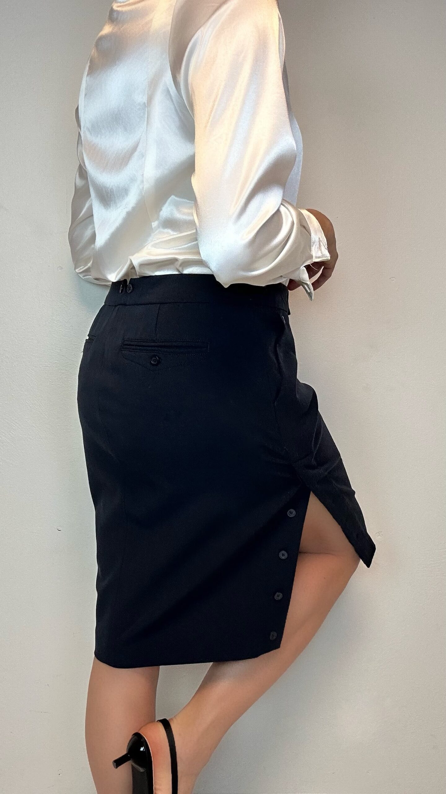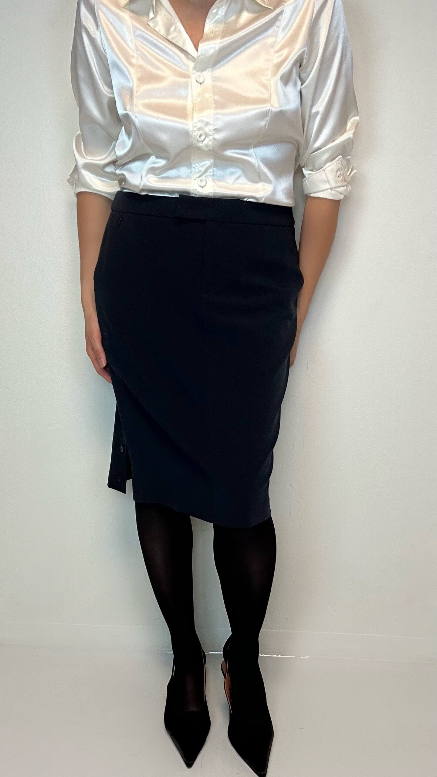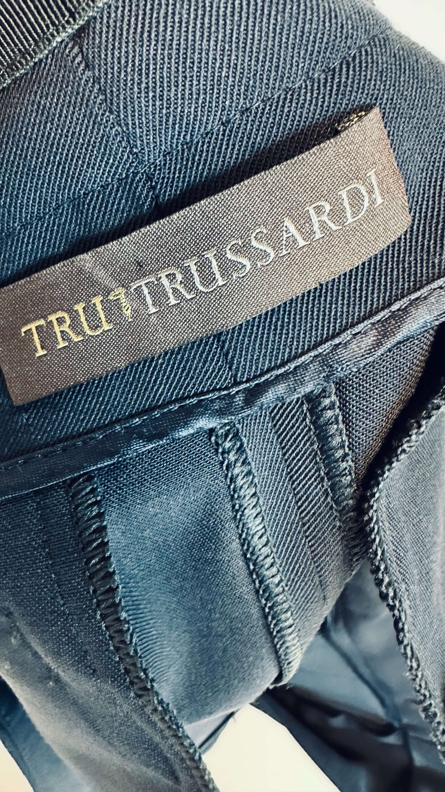 TRUSSARDI dark blue stretchy office skirtSOLD 86$ TRUSSARDI dark blue stretchy office skirt. Material: 52% Polyester 43% Wool 5% Elastane Fit: XL 86cm Waist 100cm Hips 57cm Length SOLD Categories: All, Bottoms