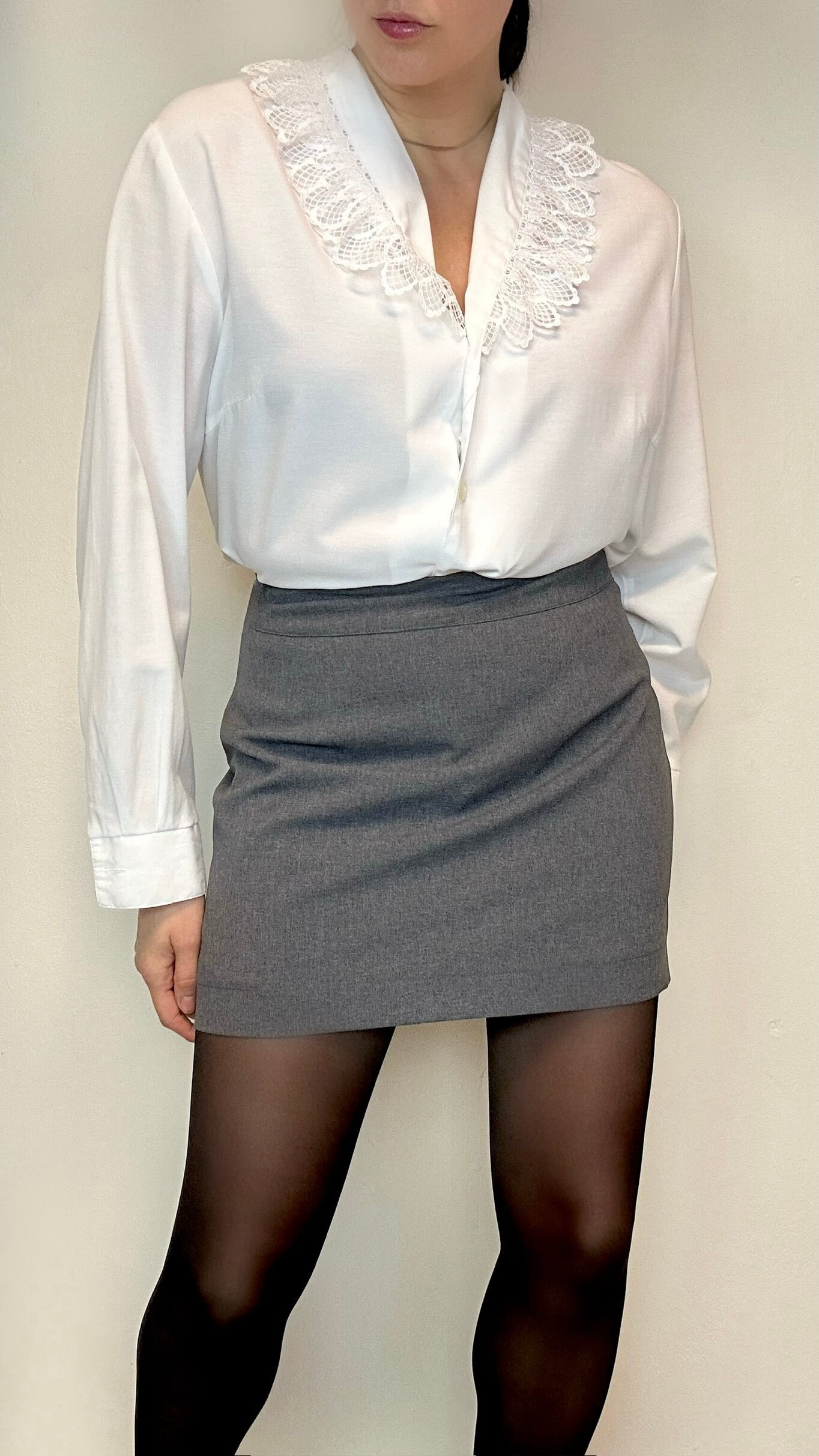 V-neck long sleeve blouse with a ruffle collar.