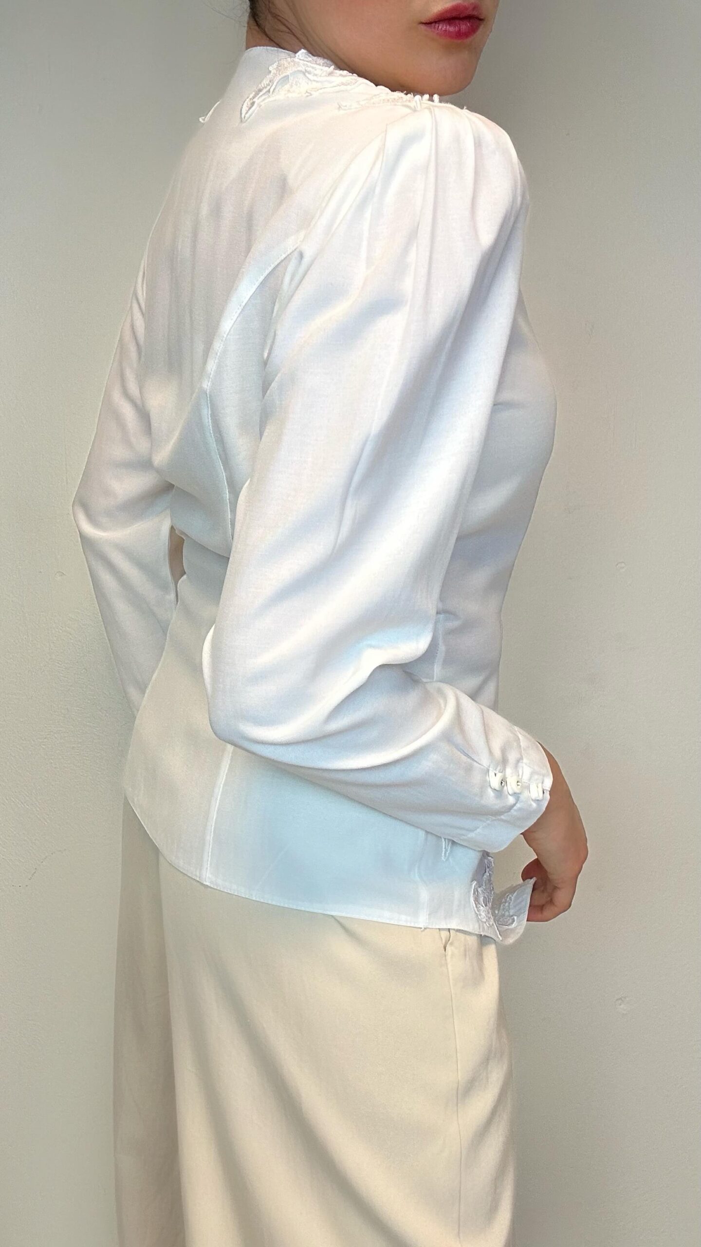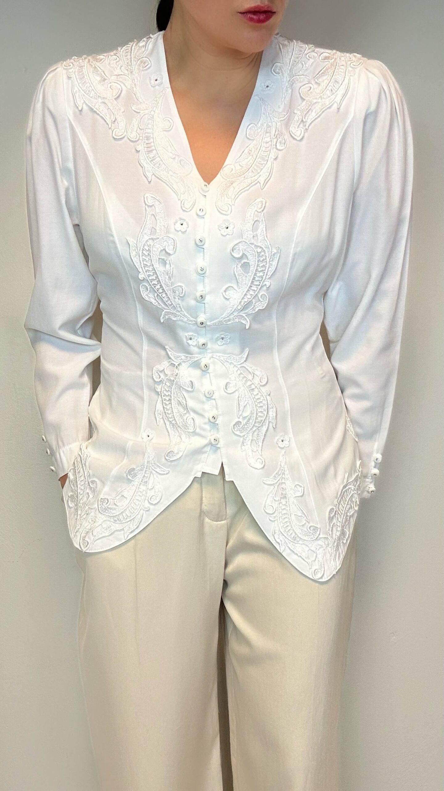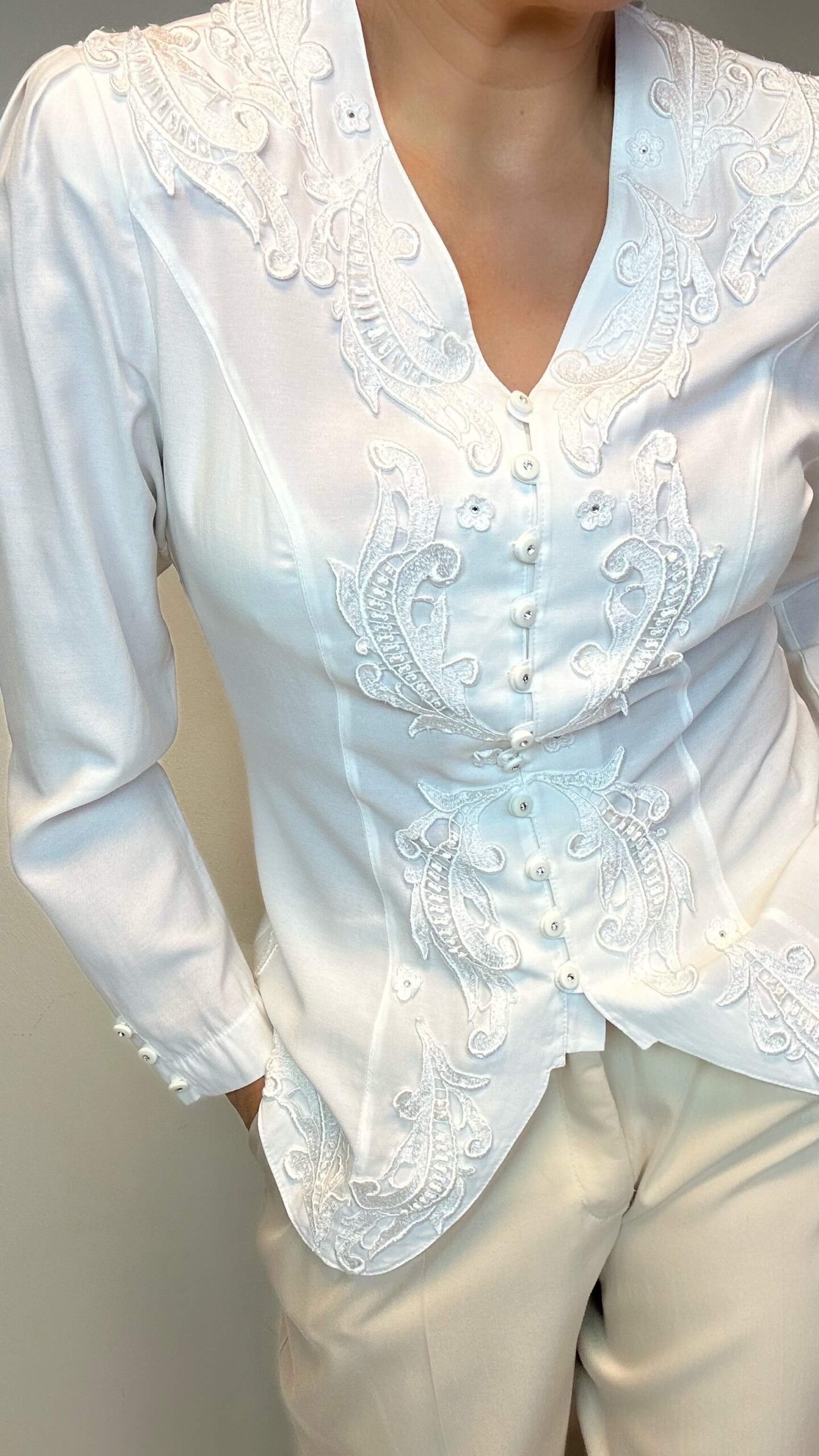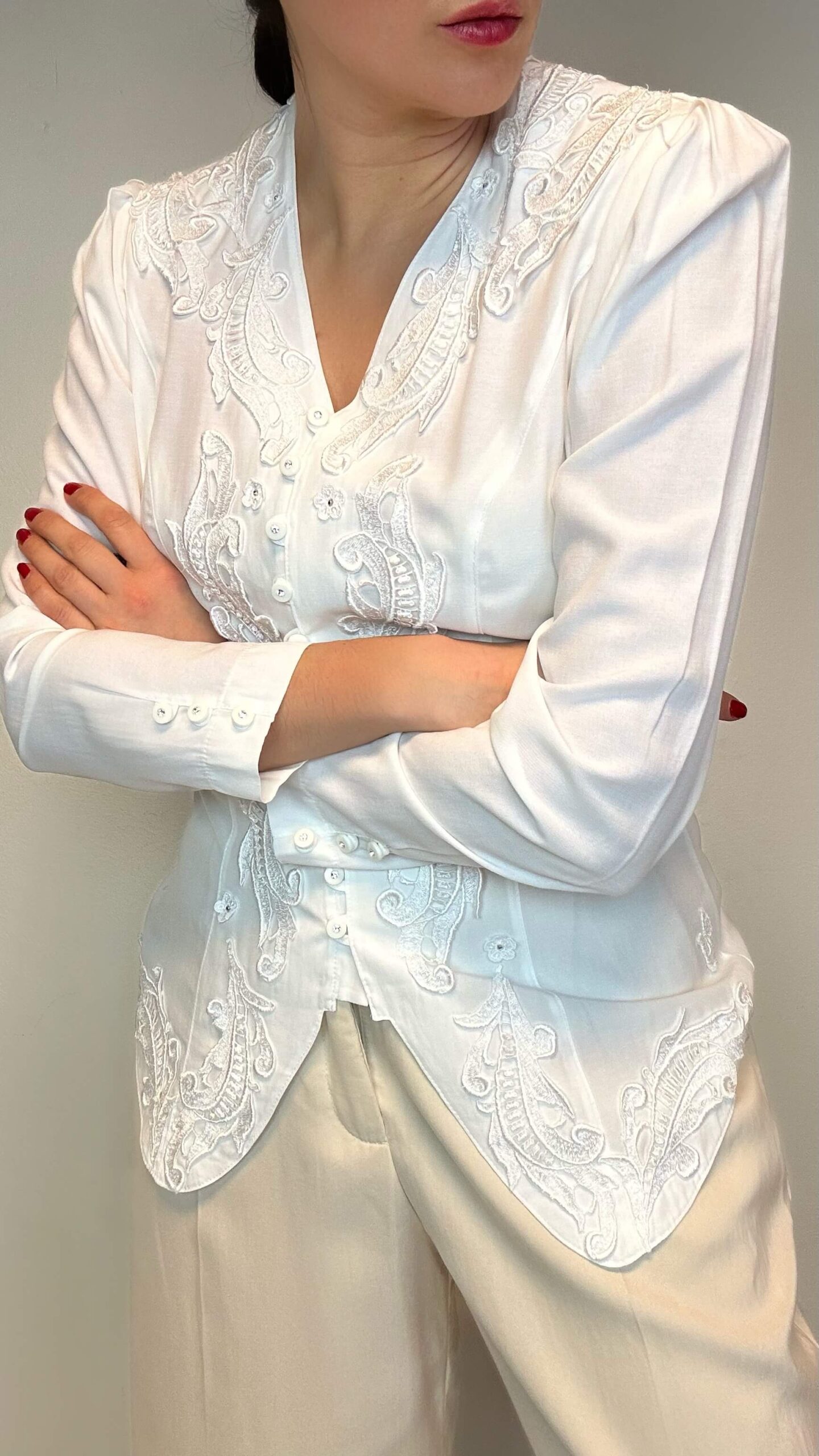 White long blouse with baroque embroidery1 in stock 85$ White long blouse with baroque embroidery Material: Viscose/Polyester mix Fit: M 40cm Shoulder to shoulder 98cm Chest 60cm Sleeve (from the shoulder) 62cm Length 1 in stock White long blouse with baroque embroidery quantity Add to cart Categories: All, Blouses