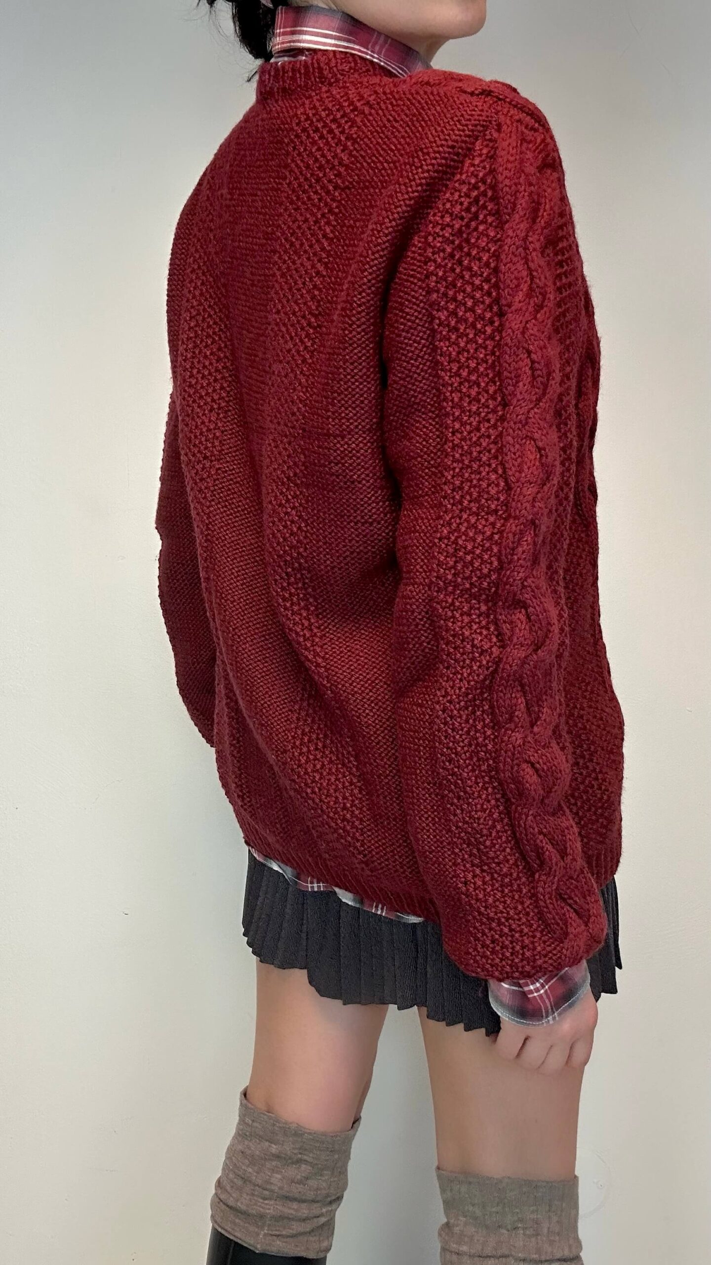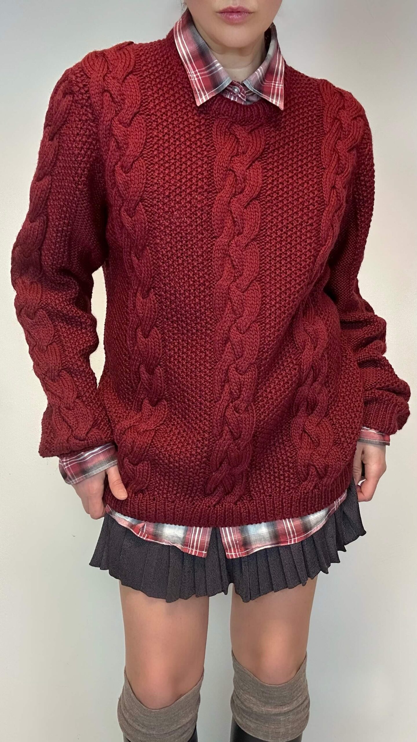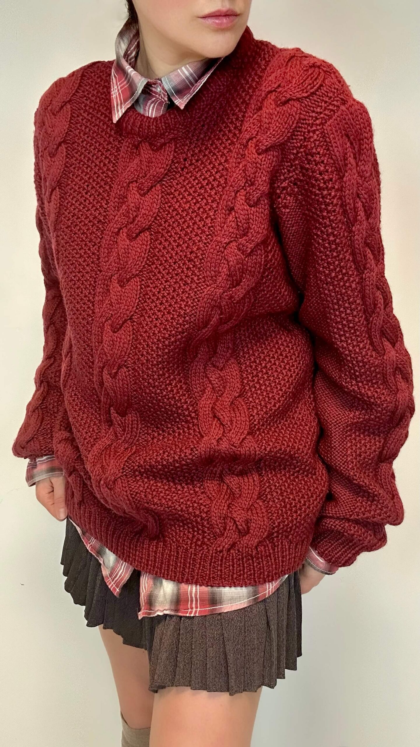 Wool burgundy chunky cableknit sweater. Fits tall ladies.