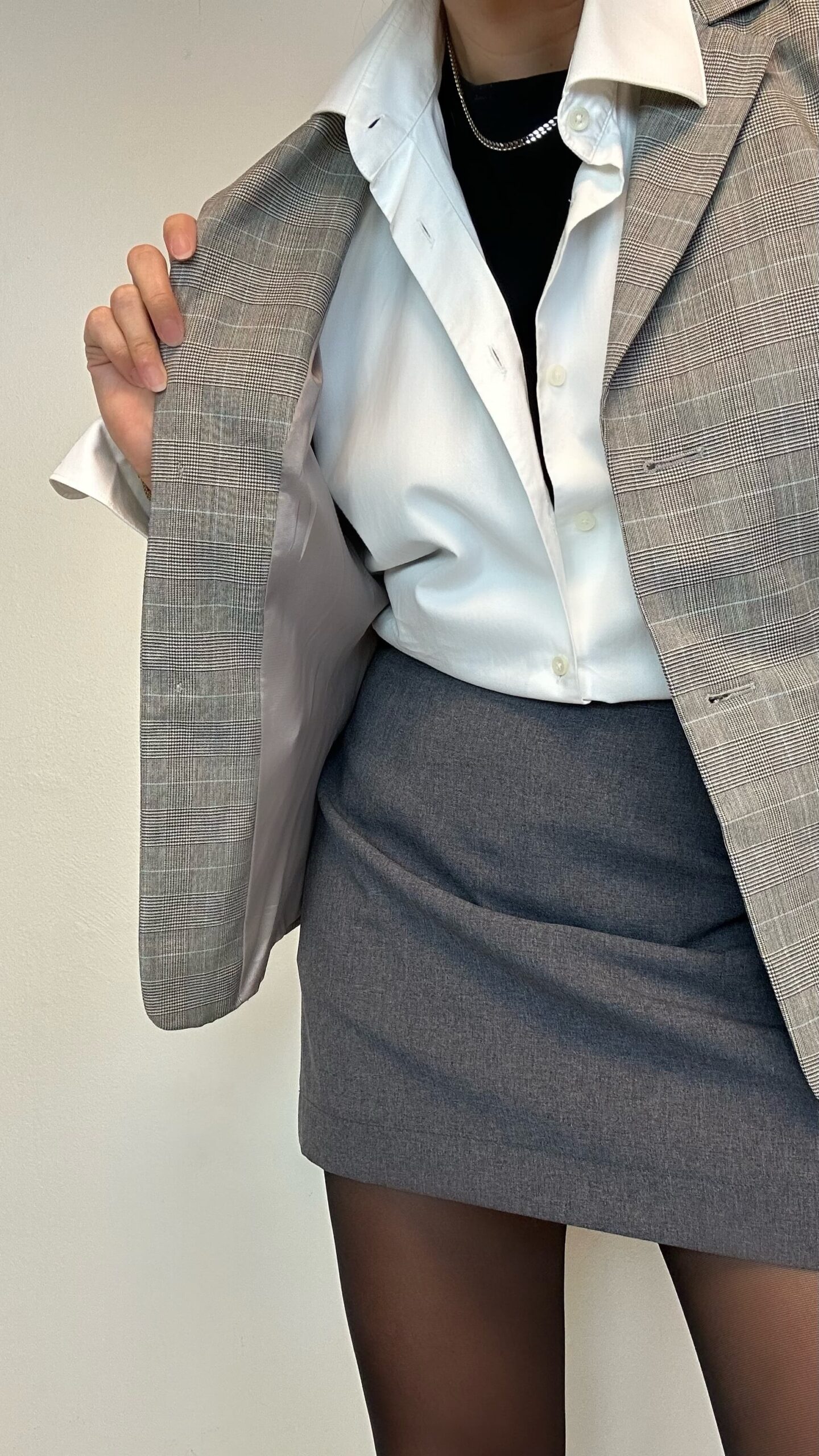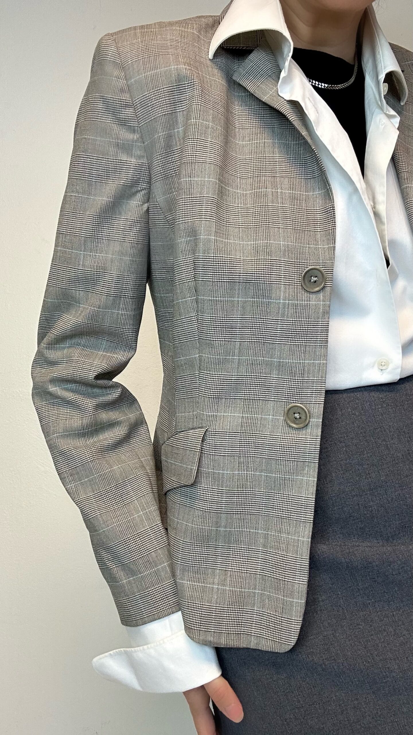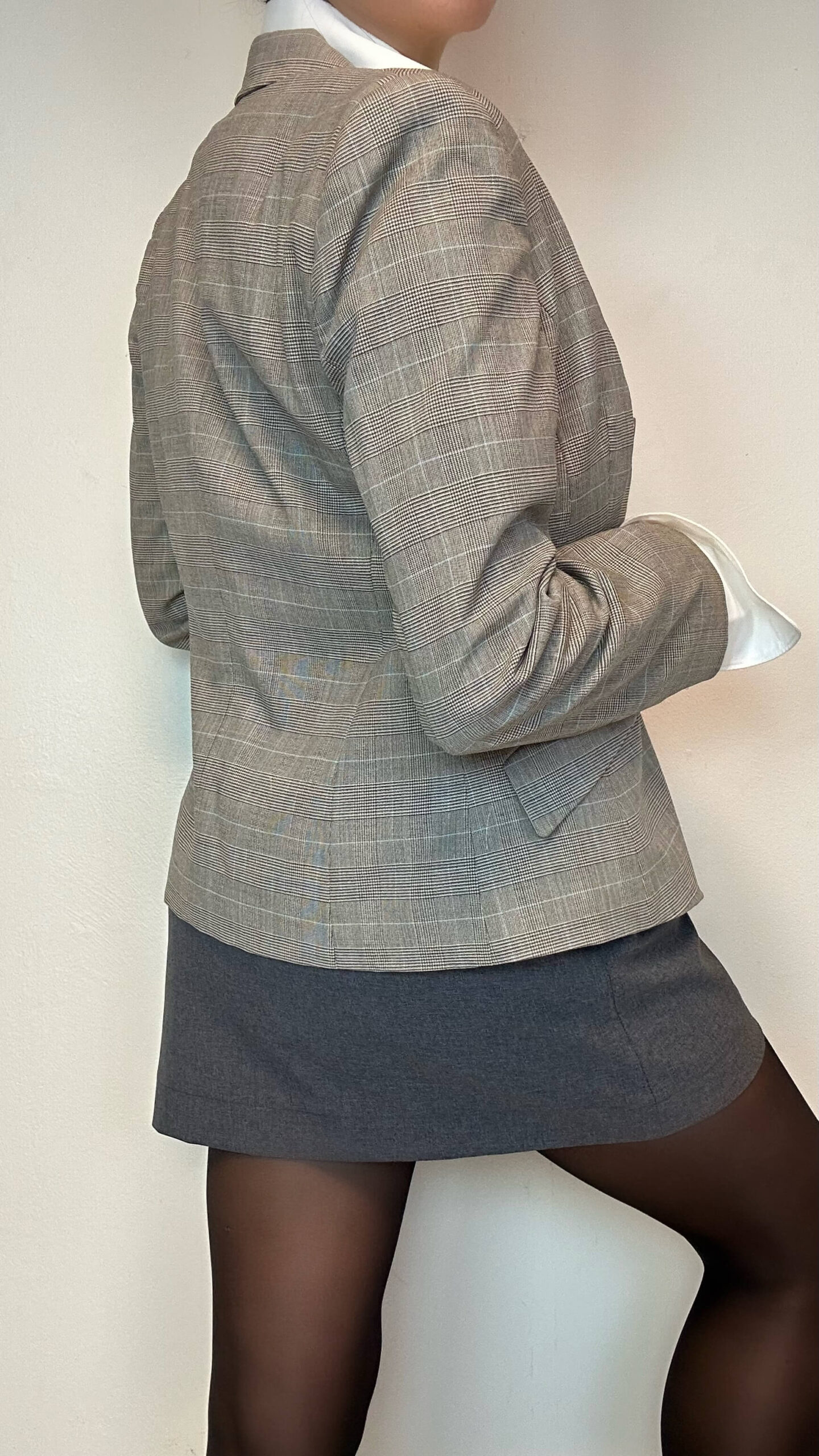 Woolen office check blazer1 in stock 100$ Woolen office check blazer. Material: 98% Wool 2% Elastane Fit: XS 40cm Shoulder to shoulder 94cm Chest 62cm Sleeve (from the shoulder) 58cm Length 1 in stock Woolen office check blazer quantity Add to cart Categories: All, Coats & Jackets